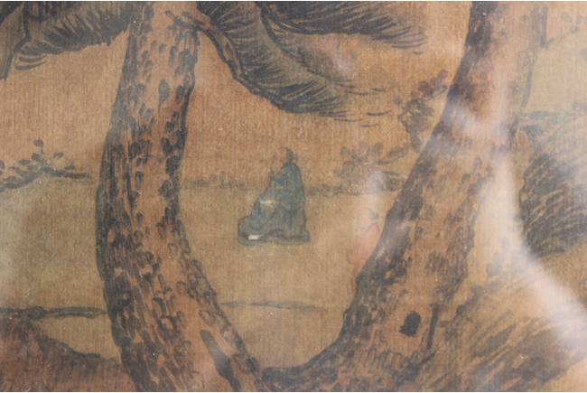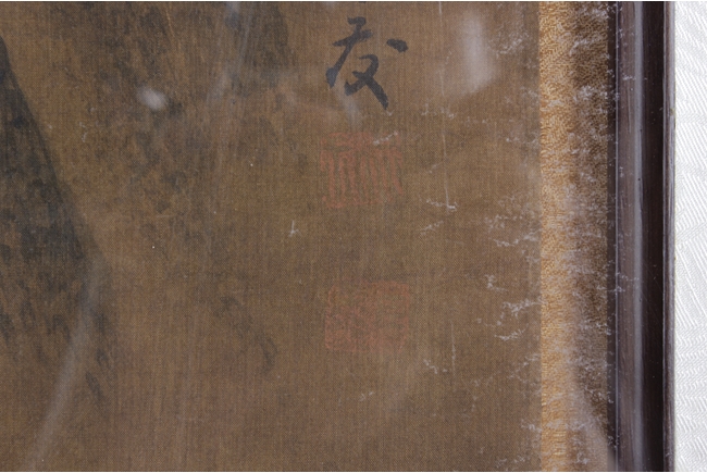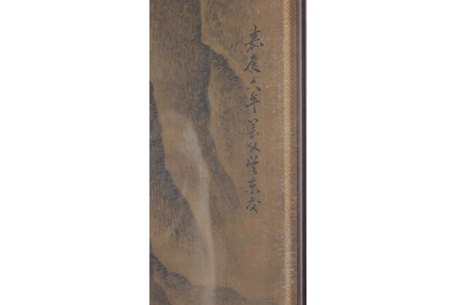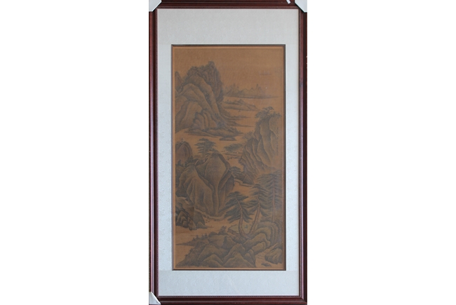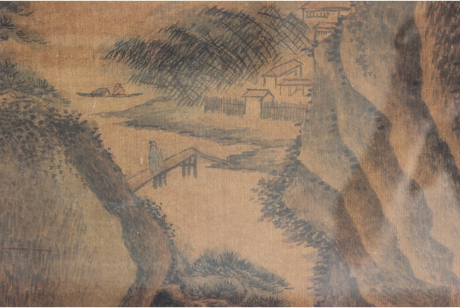 The large painting depicts a grand landscape scene with multiple mountains, rivers, trees, and people. Colophon, artist signature and mark on the right.