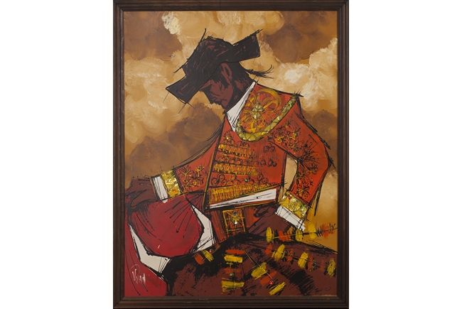 A Spanish matador wearing the traditional outfit, waving the red cloth in front of a ready to charge bull, while looking calm.