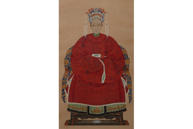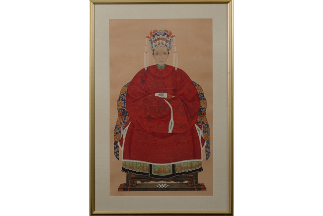 A framed multi-hue ancestor painting on paper, with elaborate hair adornment and a bright red dragon robe.