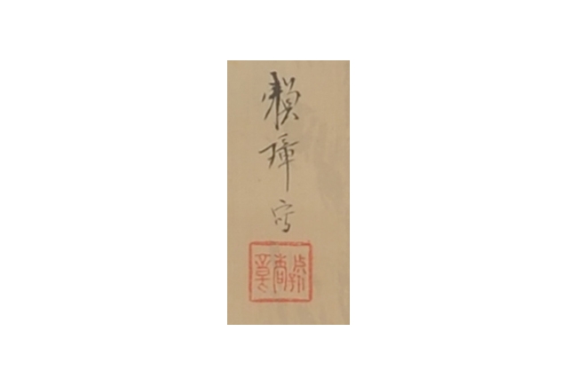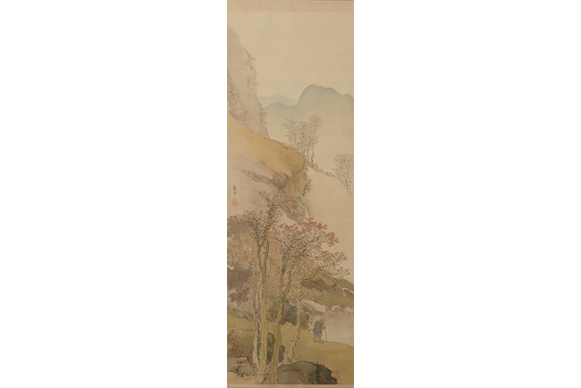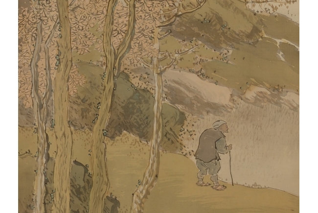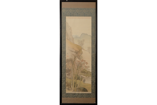 A Japanese landscape paintings of an elder standing besides lake shore and under the groves of trees, with artist signature and mark on the left side.