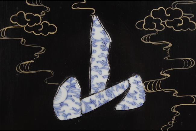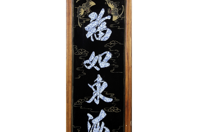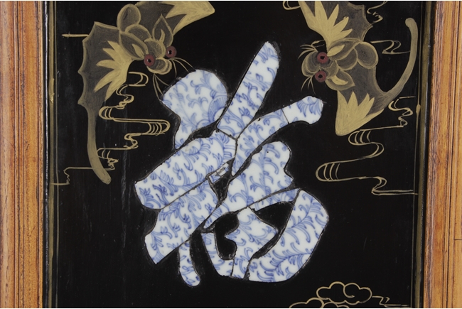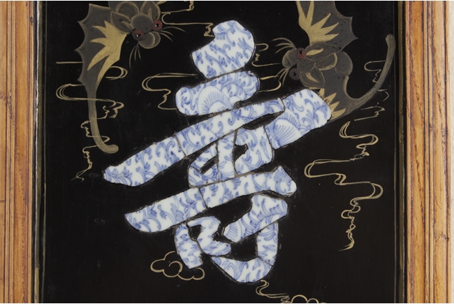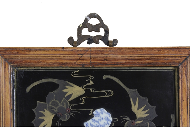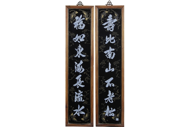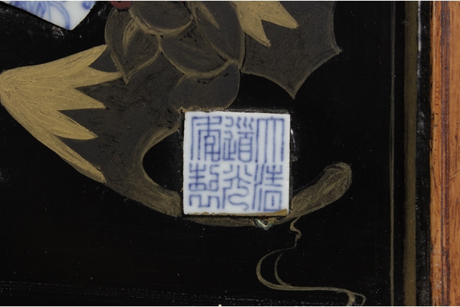The pair of hanging plaques decorated with Chinese couplet composed of blue and white porcelain, against lacquer background depicting bats and clouds, with six character "DAOGUANG" mark on the bottom right.