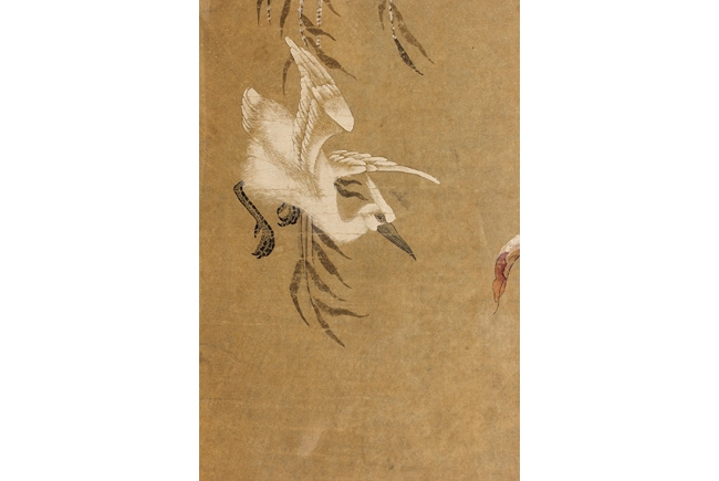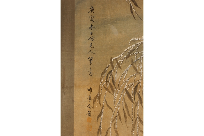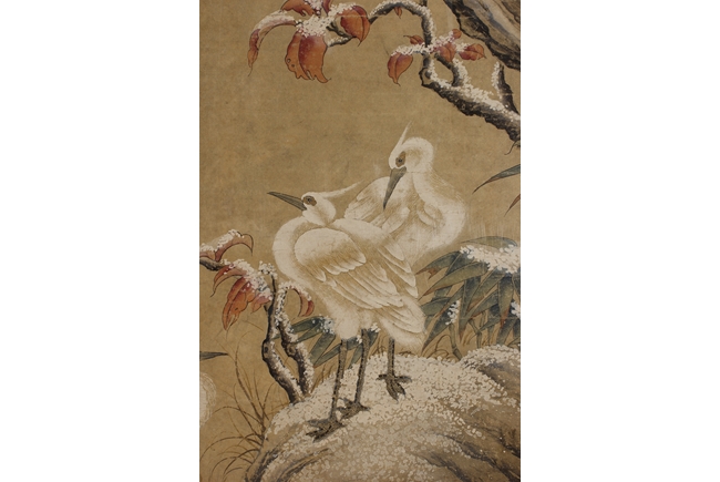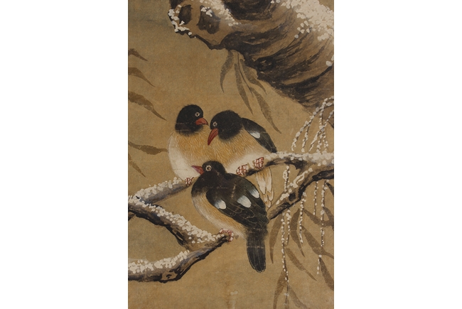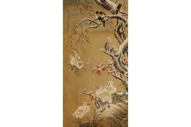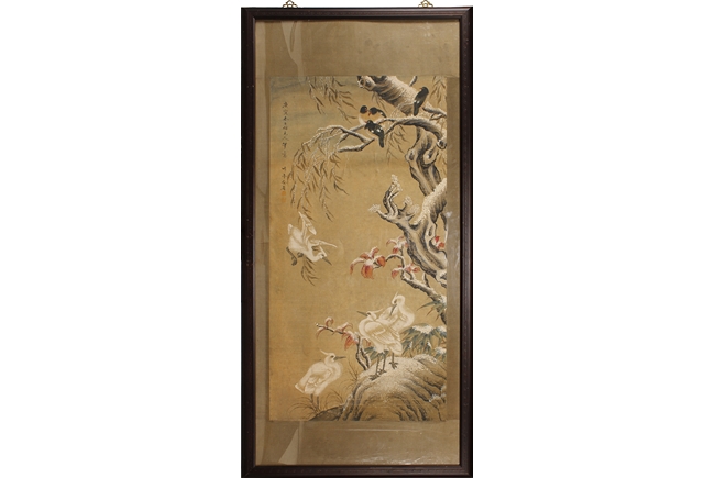 The framed painting depicts birds perched on trees in the winter setting. Four smaller birds perched on the top branches, while four larger birds stood on the rocks near base. Artist signature and mark 'Yu Sheng' on the left side.