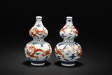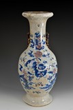 清 碎瓷青花釉裡紅雙獅雙耳瓶,口沿有傷