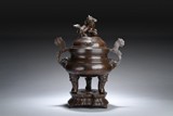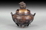 A LARGE SILVER-INLAID BRONZE TRIPOD CENSER & COVER