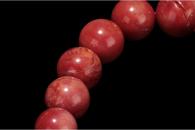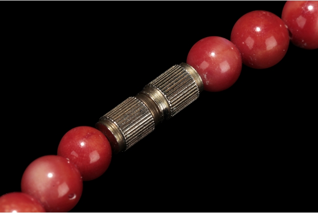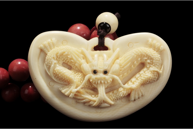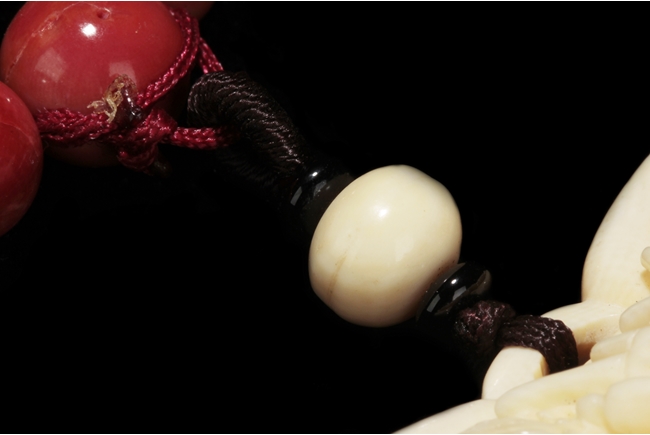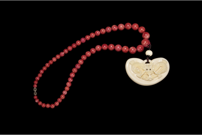 The necklace composed of graduating coral beads , the center attached with an ivory pendant, carved with four-clawed dragon, total weight 70 grams.