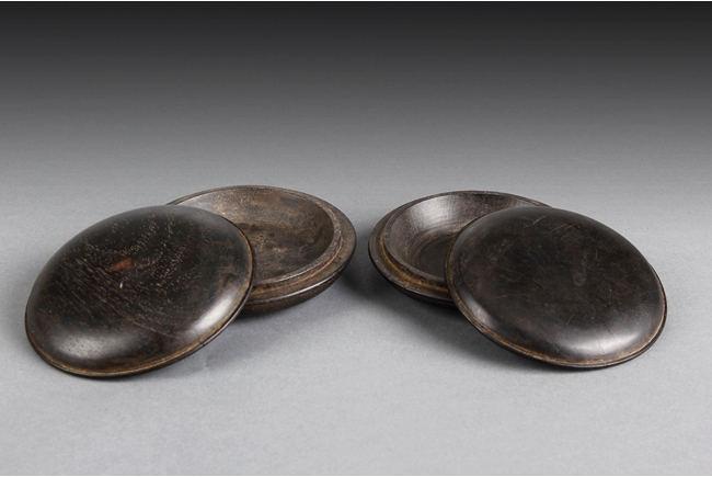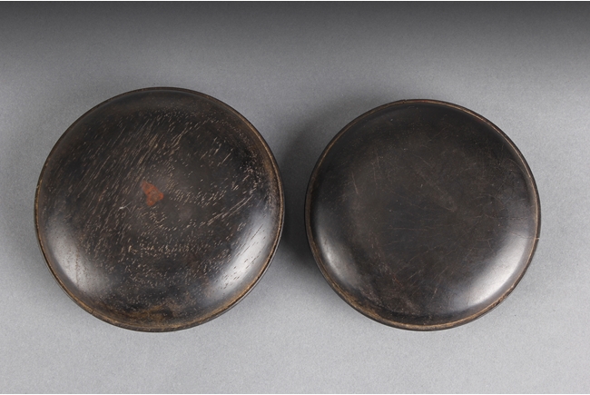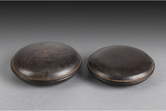 Of compressed globular form and small ring lip around lid and bottom, the ink pad box made from Zitan wood with natural colors and grains, one box with slightly larger size than the other. Qing Dynasty period.