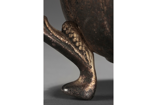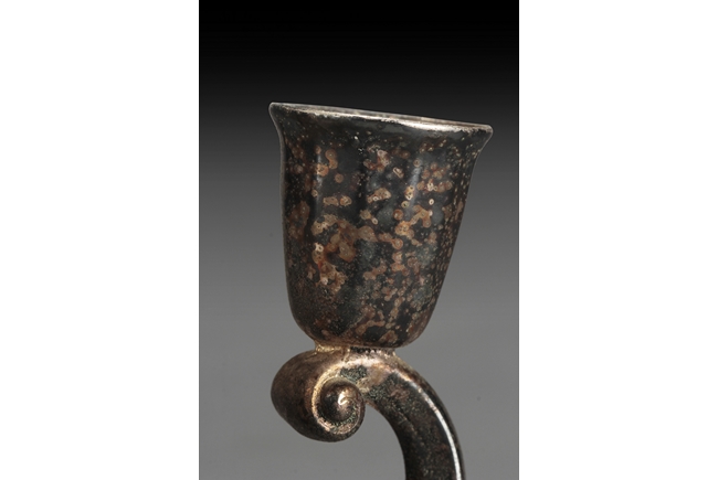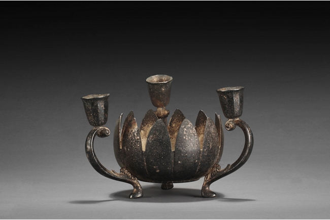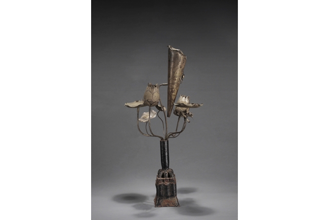 One candle holder in blossoming lotus flower form, supported by three legs extending to handles with bulb-shaped candle holders on top. The other candle holder is composed of multiple flowers, leaves, and bulbs, with the two bulbs on the side and the large bulb in the center acting as candle holder, the base made of iron and was not original. 18th century.