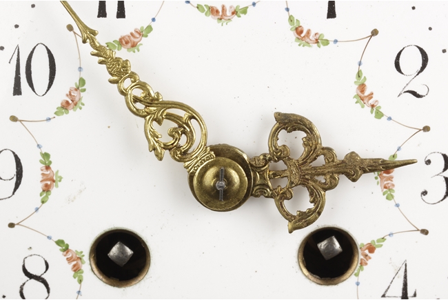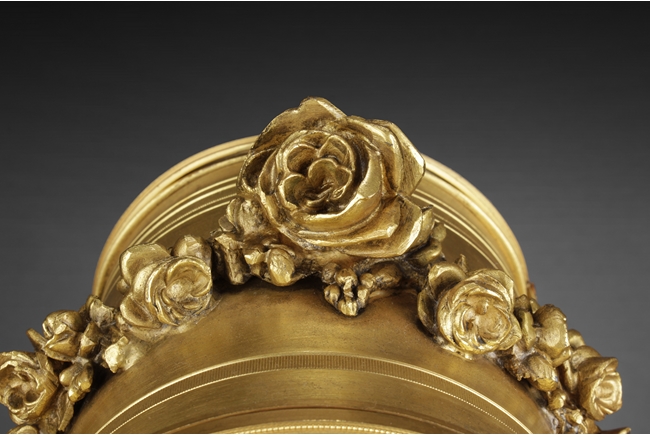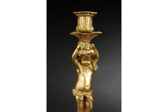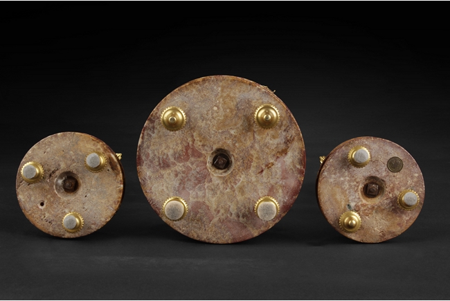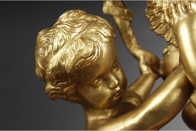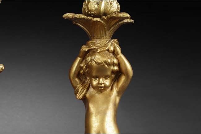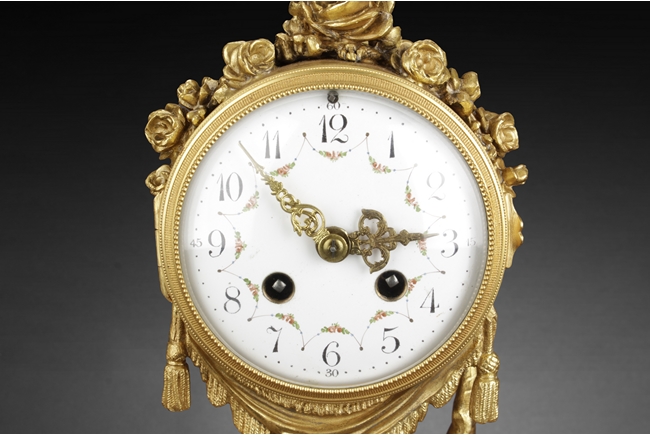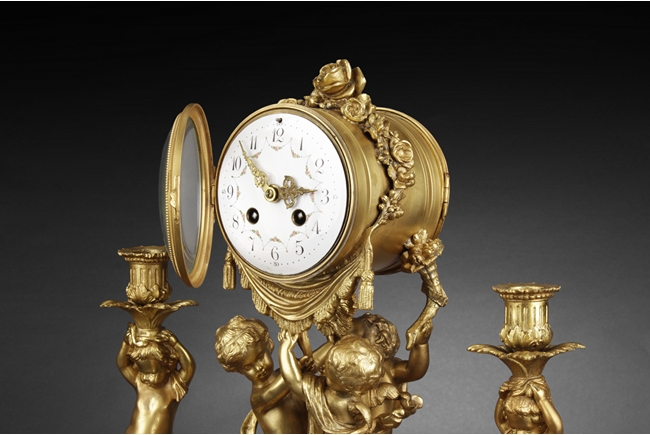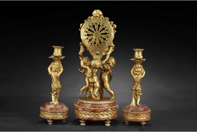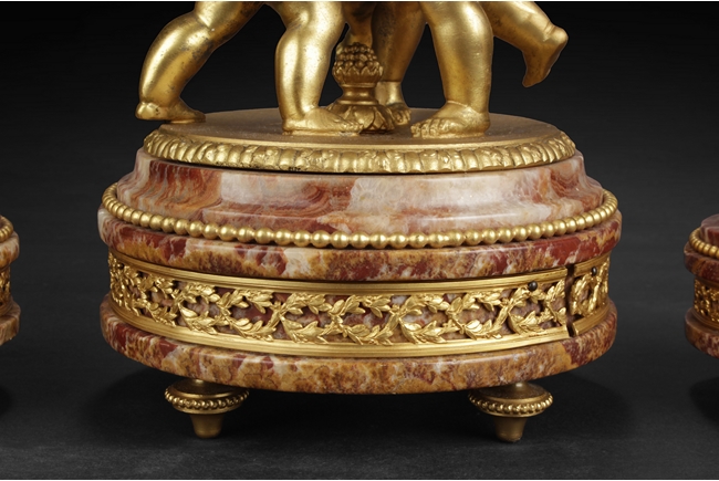 The set includes a clock and two candle holders. The clock with white circular dial and movement, surmounted by rose flowers, supported by three cupid, the candle sticks also in the form of cupid, all standing on round marble stone.