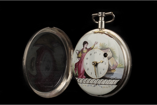 Of circular form, one watch with Jesus on the cross with a praying lady, the other watch with a lady holding flower basket near a house, both made with silver and require manual winding. 18 to 19th century.