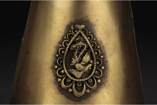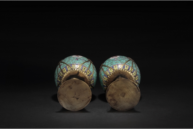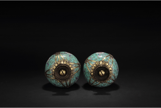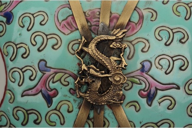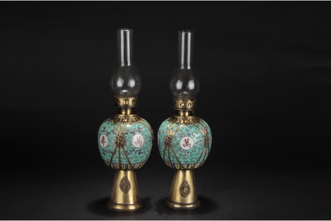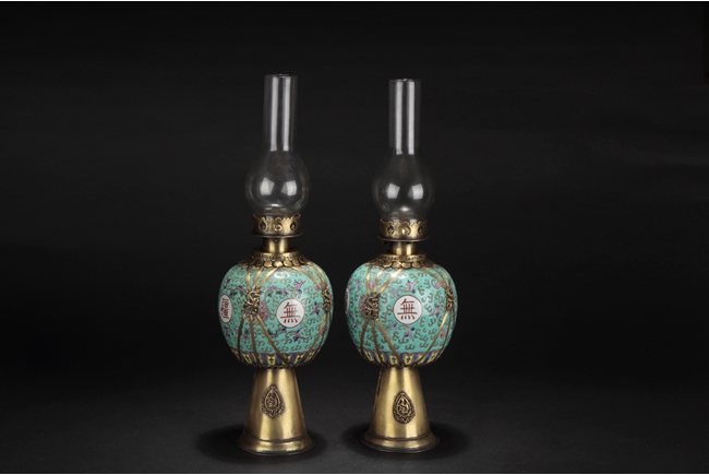 Of globular form, the body with four round medallions around Chinese characters "Wan Shou Wu Jiang", surrounded by flowers and vines, applied on top of teal ground. A bronze cone supports the lamp from bottom, a pair of three bronze strips with a dragon secure the middle, and bronze enclosures on top attached with glass, forming an oil lamp. 19th century.