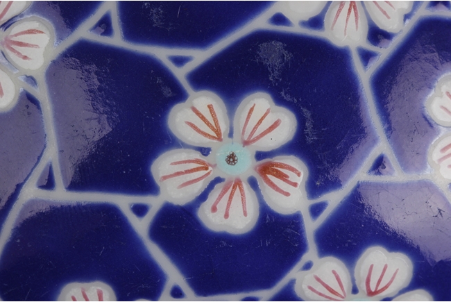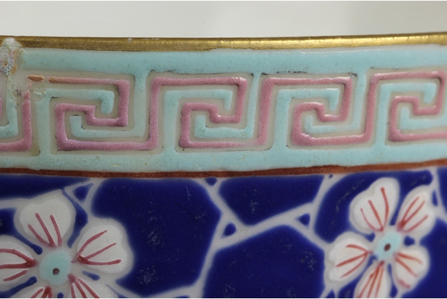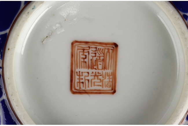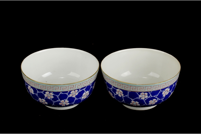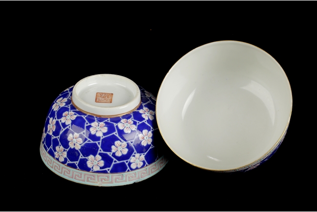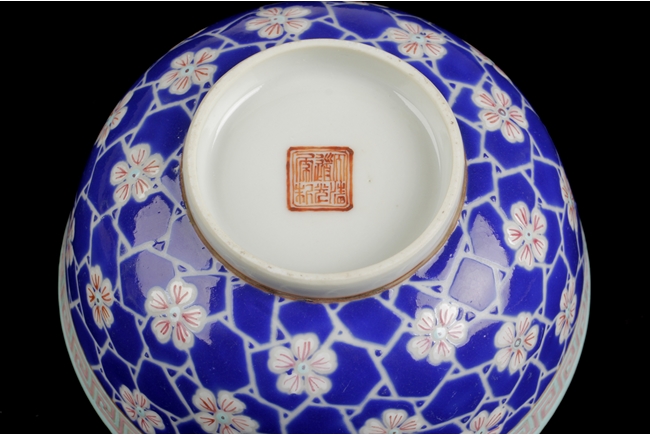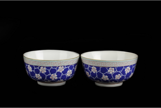 The bowls drawn with plum flowers spread across blue ground on the exterior, below a scrolling wave pattern, bottom bears six characters "DAOGUANG" mark. Qing Dynasty period.