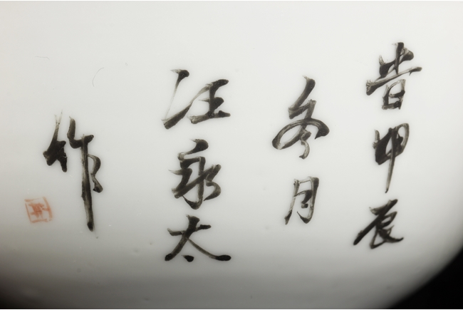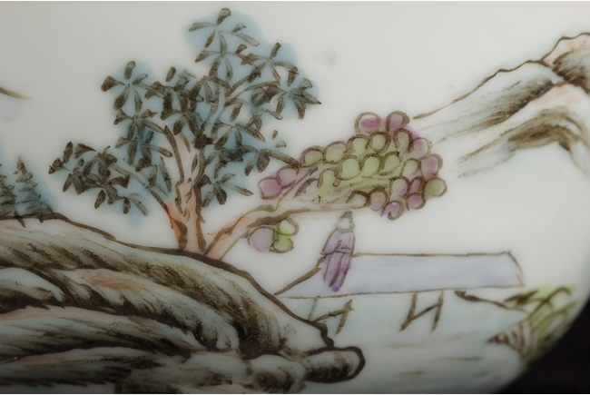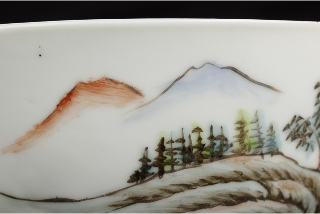 With rounded sides supported on a straight foot ring, brightly enameled around the exterior with a landscape scene and artist signature and mark "Wang Yongtai", bottom bears four character "Guanyao Neizao" mark. Qing Dynasty period.