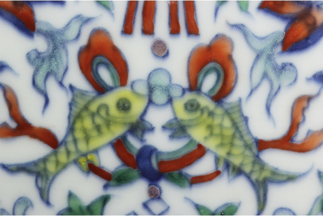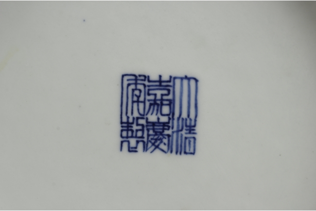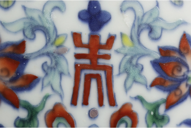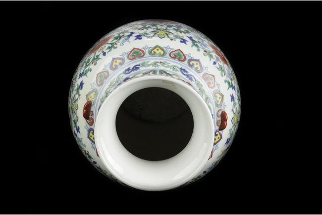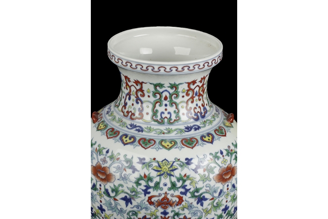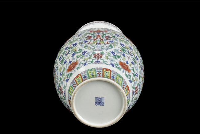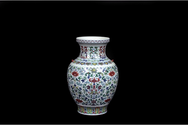 Supported on a splayed foot, the ovoid body with gently swelling shoulders surmounted by a broad waisted neck and flaring mouth, superbly painted with flowers in full bloom amongst a dense bed of foliage and stems, in between scrolling ruyi band on top and lappet band on bottom, the shoulder applied with a pair of small red handles, bottom bears six characters "JIAQING" mark. Qing Dynasty period.