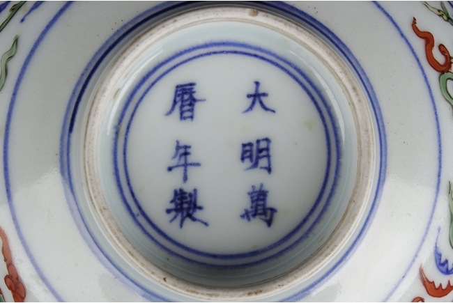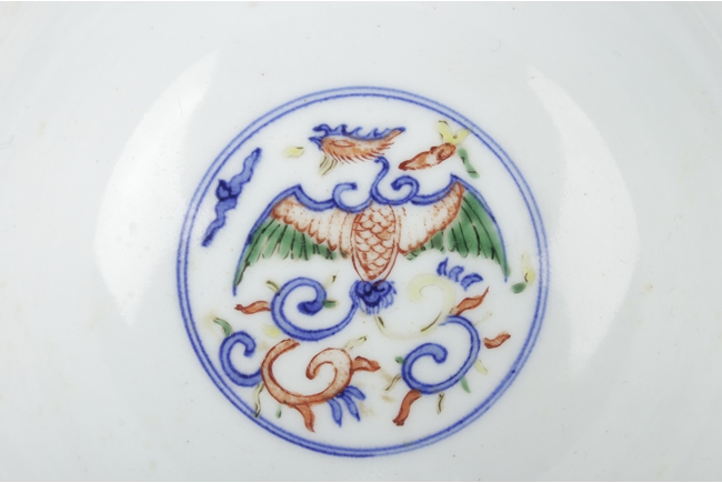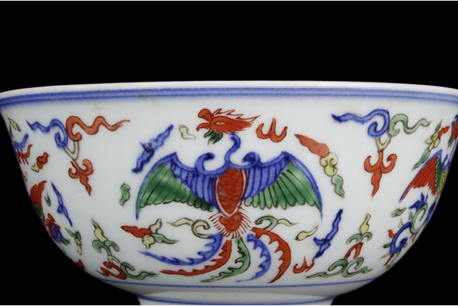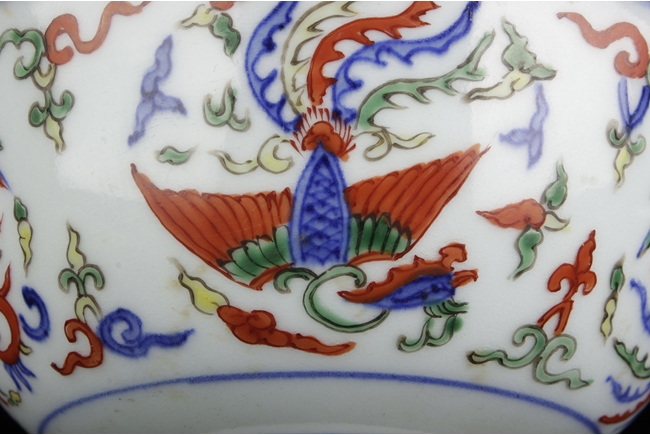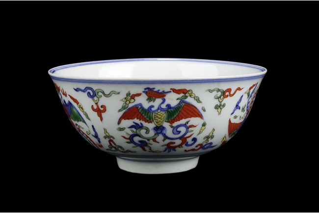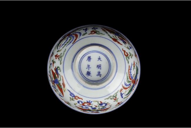 The deep bowl tapers to a straight ring foot, body painted with five medallions of phoenix, the interior with a similar phoenix, and the bottom with six character "WANLI" mark. Qing Dynasty period, in imitation of Ming Dynasty.
