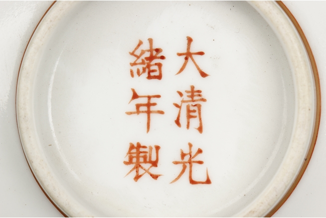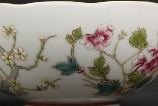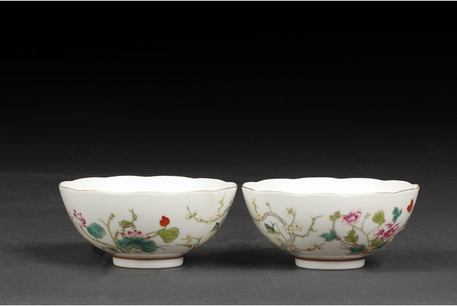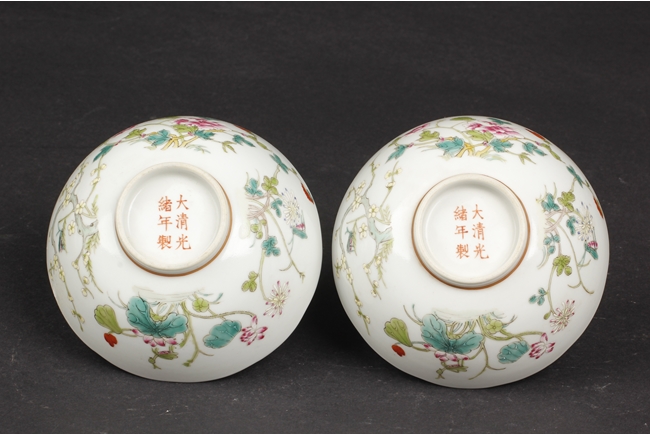 The edges of floriform, the exterior of bowls beautifully enameled with blossoming flowers such as orchid, prunus, chrysanthemum, lotus, and peach flowers, with a mantis perched on the lotus flower; the interior enameled with a bat flying over two peaches, and the bottom bears six character "GUANGXU" mark. Qing Dynasty period.