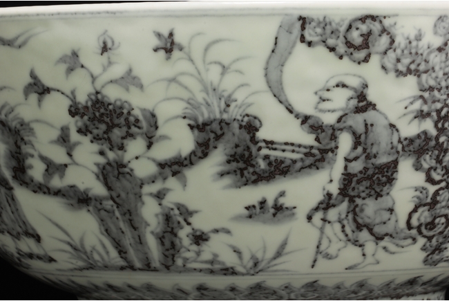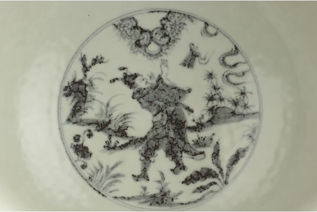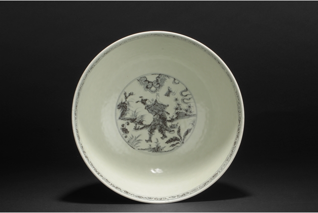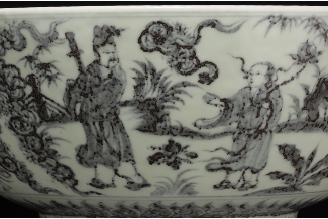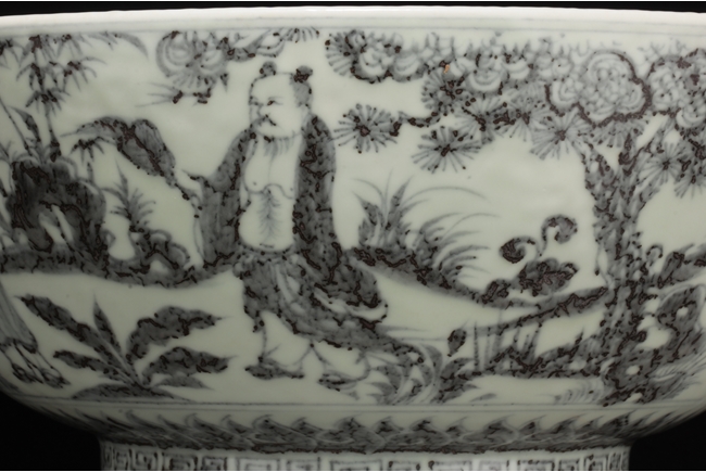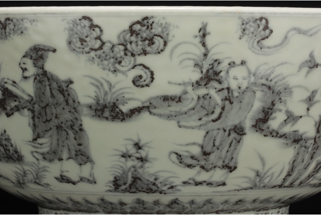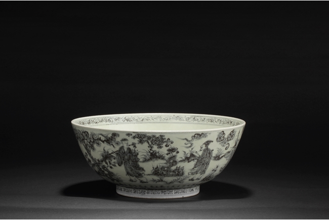 Painted in underglaze blue of cobalt tone, the exterior depicts the Eight Immortals in forest setting, the interior with a similar motif. Ming Dynasty period.