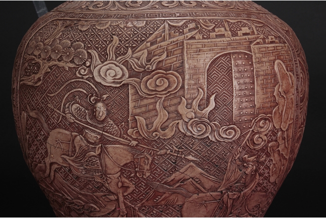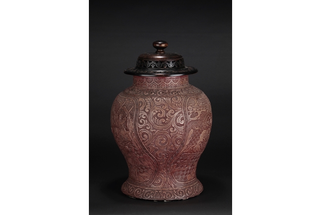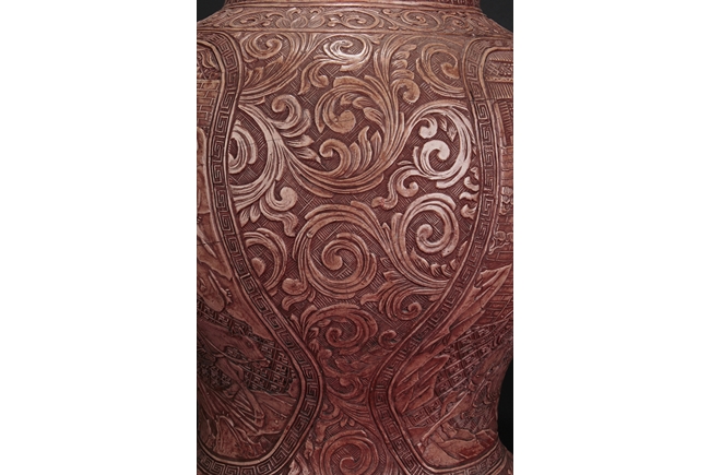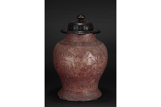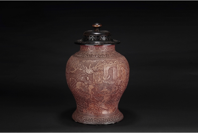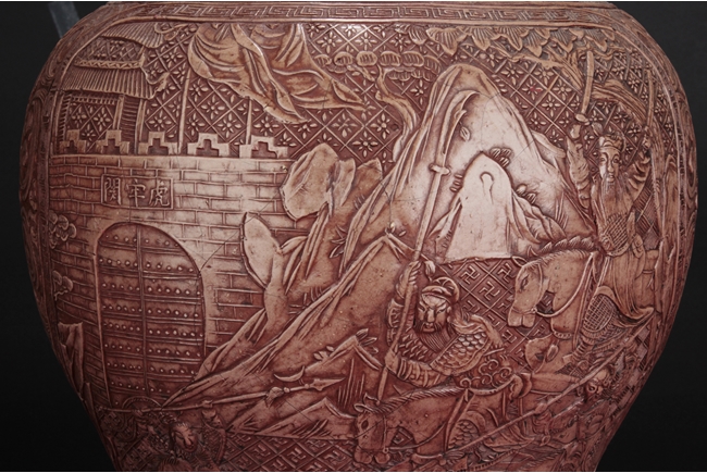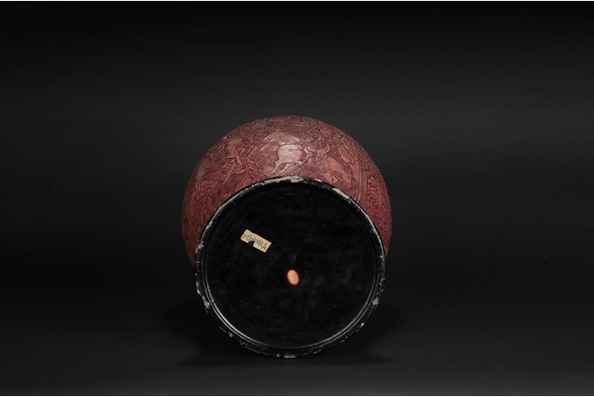 Of baluster form, the exterior carved with two battlefield scenes from Romance of the Three Kingdoms novel, one scene with Lü Bu and Dong Zhuo charging away from the gate, the other scene with Lü Bu fighting against Guan Yu, Zhang Fei, and Liu Bei in front of Hulao Gate, all encircled within key-fret patterns, the remaining space carved with flower and vine patterns. The lid pierce carved, and the bottom with black lacquer. Qing Dynasty period. Provenance: Estate of Thomas Chang of United States