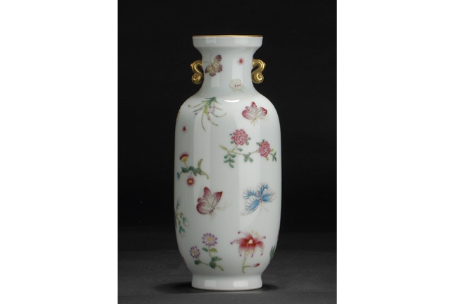 Of rounded drum form, the exterior decorated with blooming flowers and colorful butterflies, a pair of gild elephant mask handles applied to the neck, the rim gild as well. Bottom bears four character "YONGZHENG" mark. 19th century.