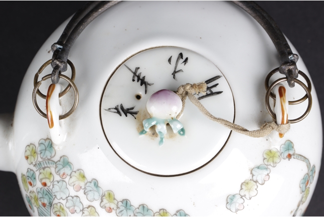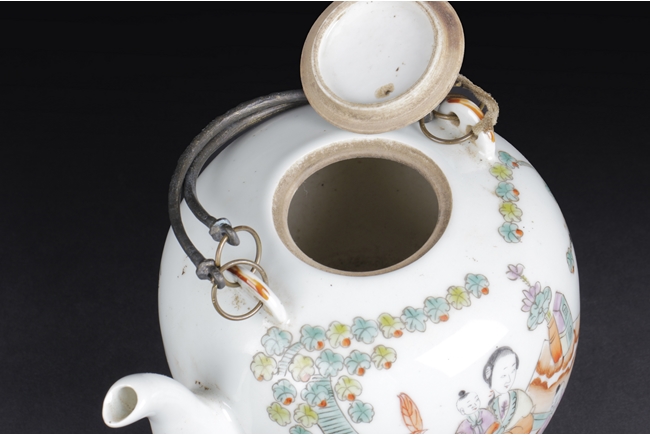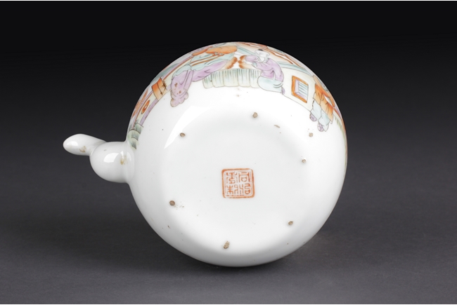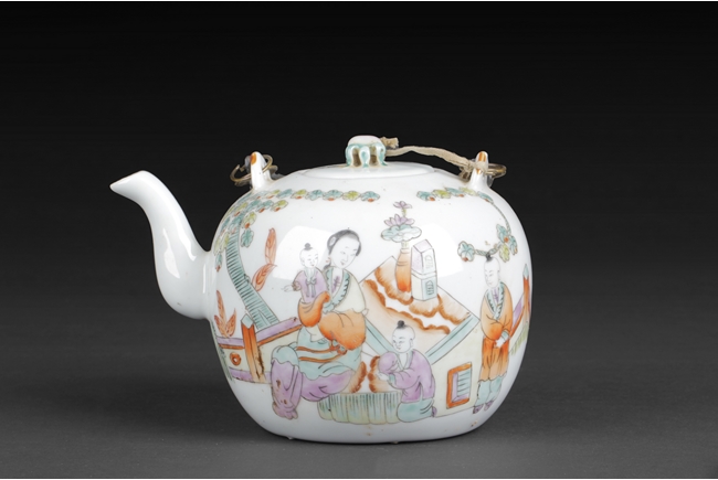 Of globular form, the teapot's exterior painted a mother with a baby and two kids in a garden scene, with a Chinese poem and artist signature on the back, the high shoulder with two arched handles, the lid with a pear shaped knop, and bottom bears four character seal. 19th century.