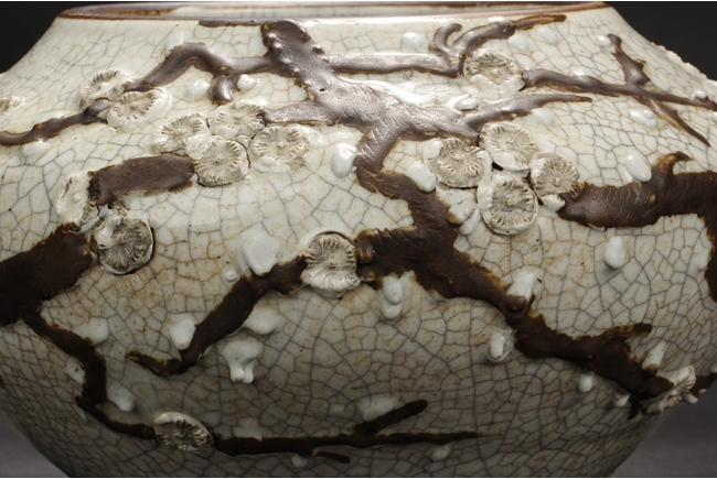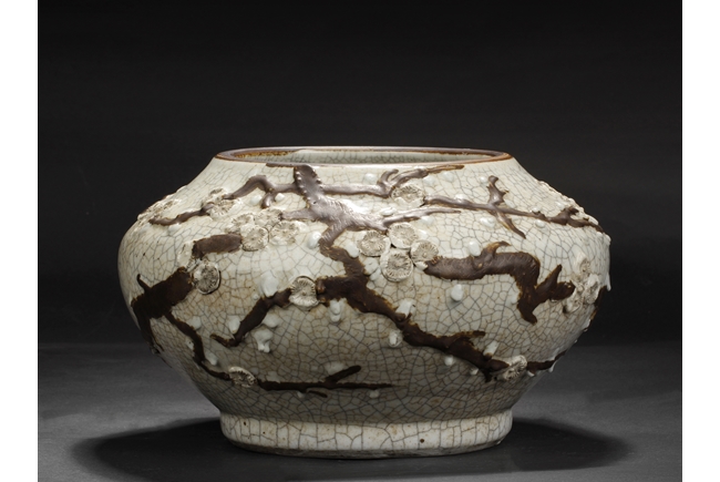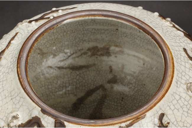 Of globular form, the jar depicts flying dragons amidst clouds, over white glazed crackleware patterns, the bottom bears four character mark "CHENGHUA". Qing Dynasty period.