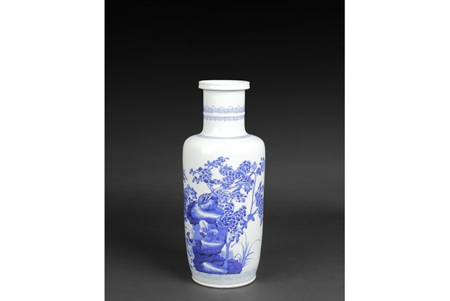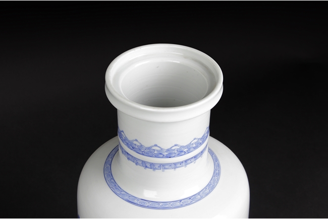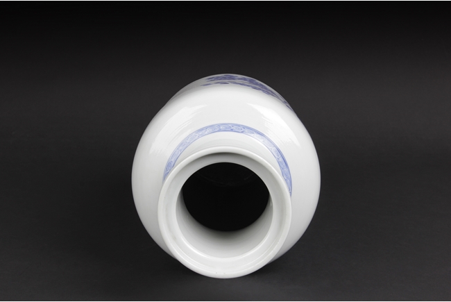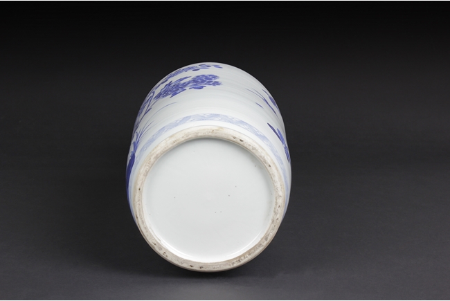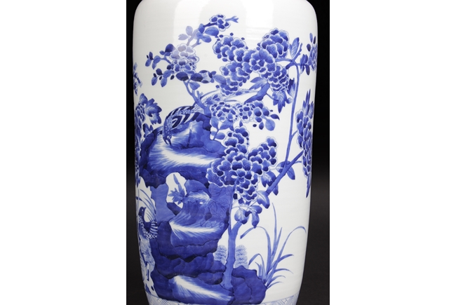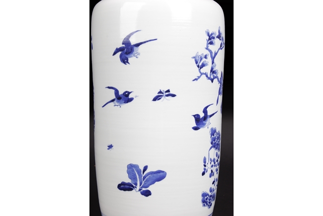 Of baluster form, the high shoulder tapers down to ring foot, the exterior painted with two magpie birds perched on the blossoming peony flower branches, and more magpie birds and butterflies flying nearby. 19th century.