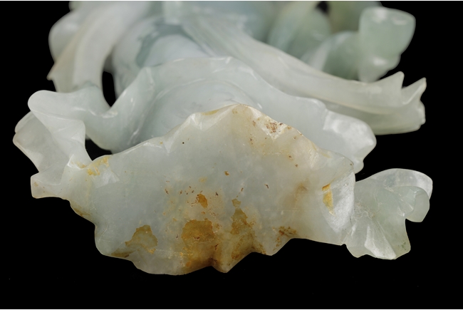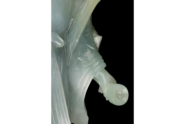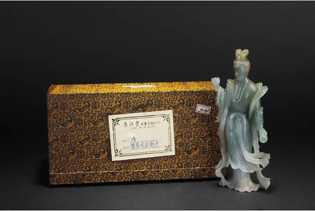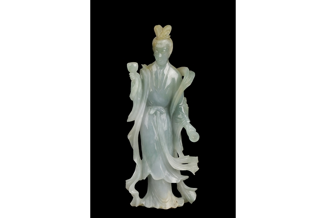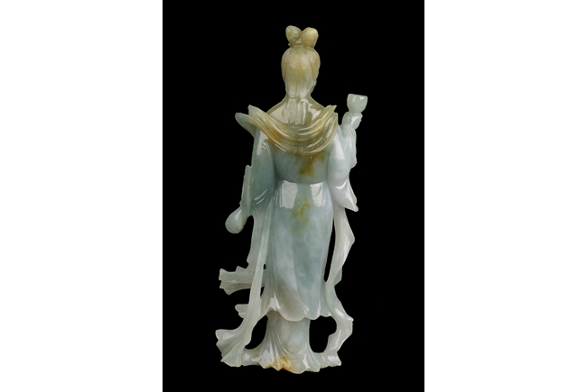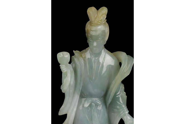 The figure carved from natural jadeite, the stone with mostly semi-transparent blue and white color along with a little russet, cleverly carved to depict hair color. The figure depicts a lady musician, wearing flowing robes, standing and holding onto a pair of Chinese musical instruments. Qing Dynasty period.