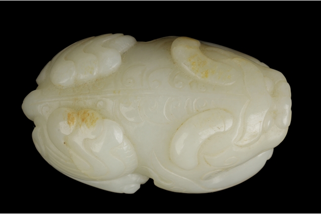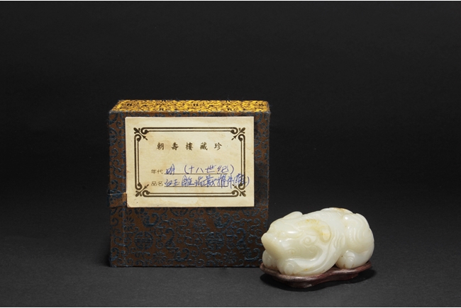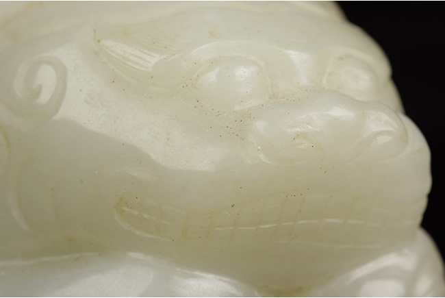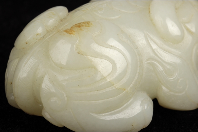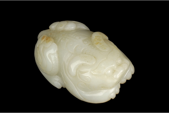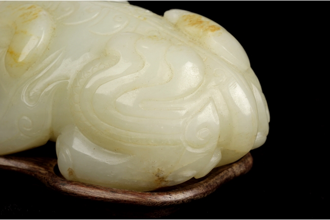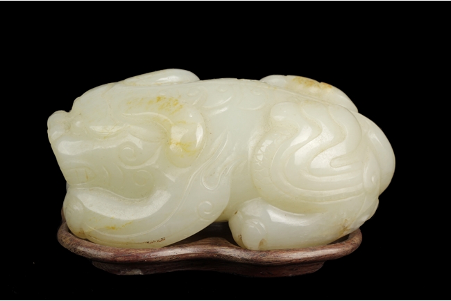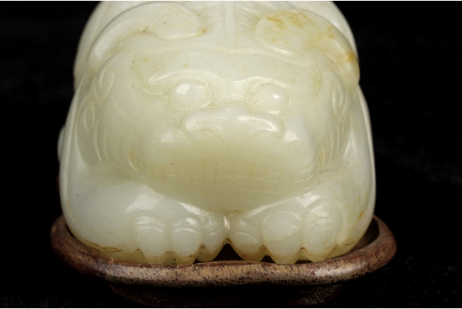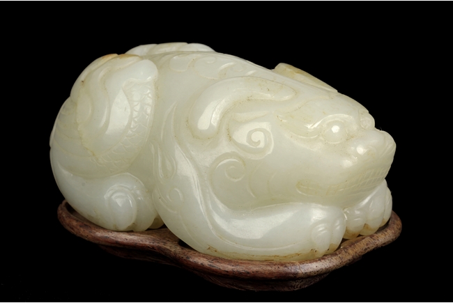 The figure depicts a playful mythical beast, prowling with all four legs low on the ground, grinning with open mouth, and eyes wide open. The stone of white color with very slight russet, natural markings present. Includes wooden stand. 18th century.