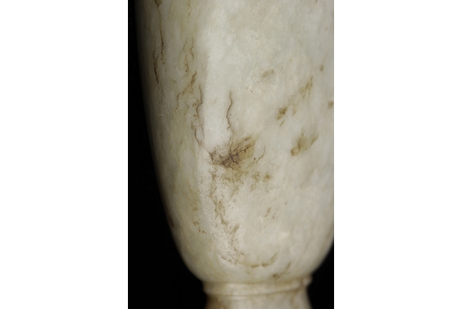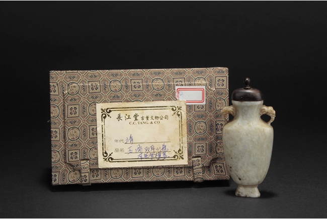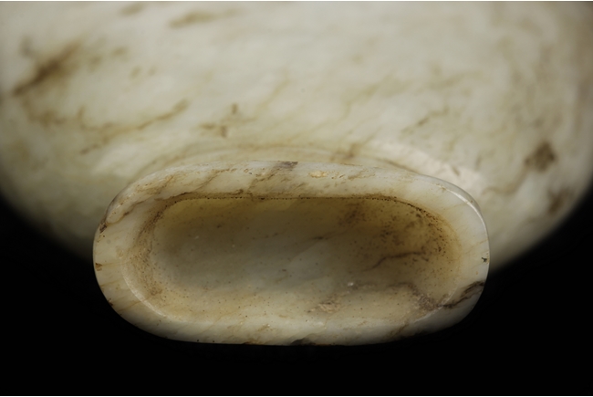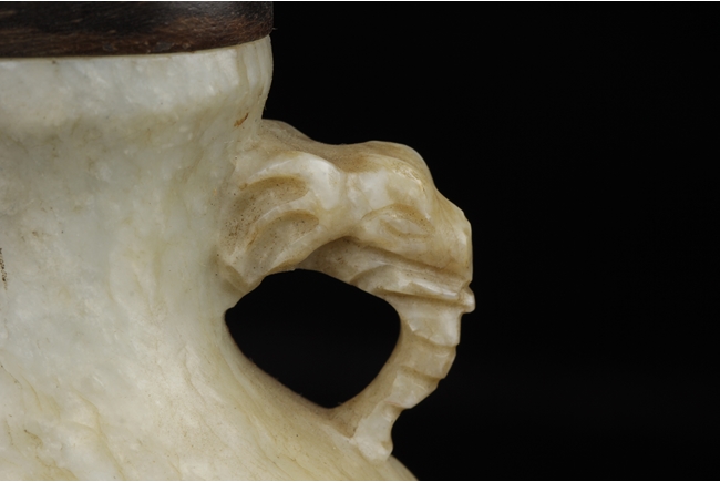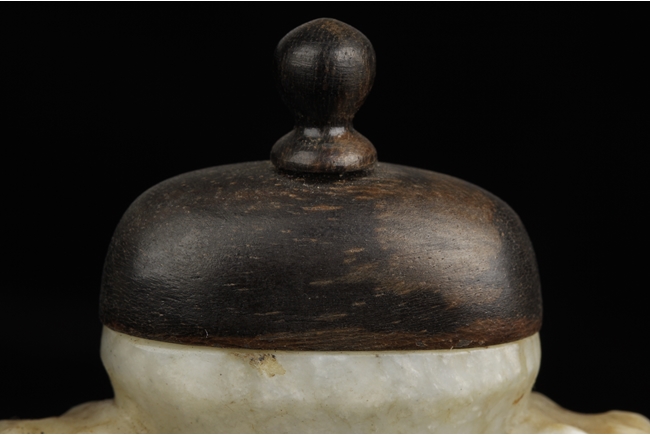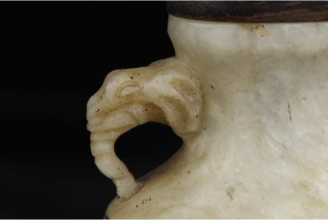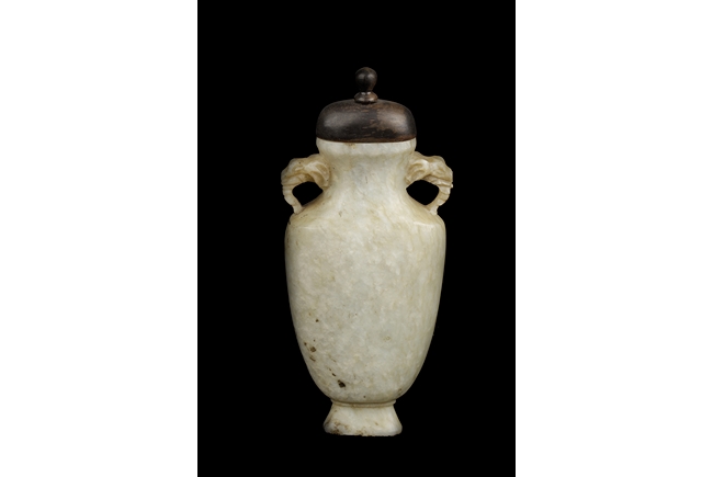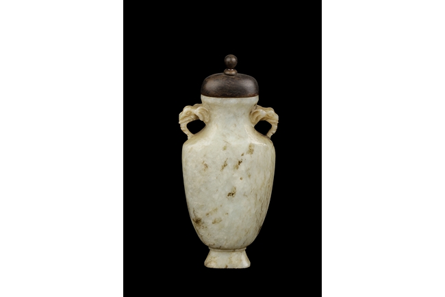 The vase of flattened ovoid form, with splayed foot rim, two elephant mask handles, and a Zitan wood cover. The stone of white color with russet. Qing Dynasty period.
