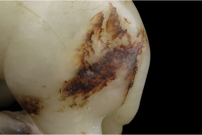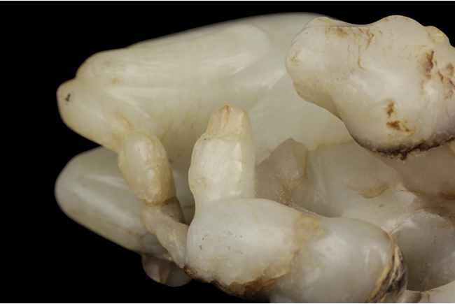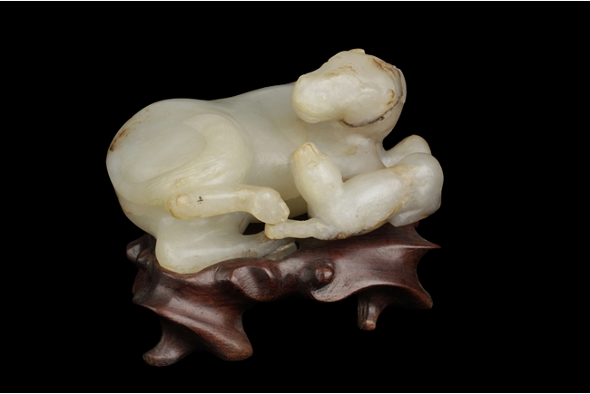 The figure well carved, depicting a fowl playing around with its mother, the horse laying sideways with head tilted. The stone of white color with few russet patches and natural marks. Includes wooden stand. Ming Dynasty period.