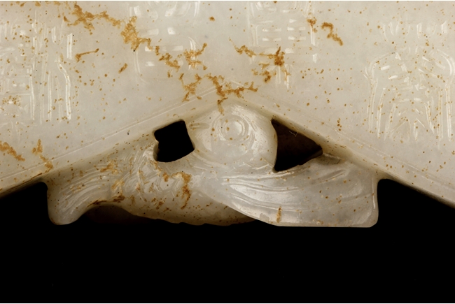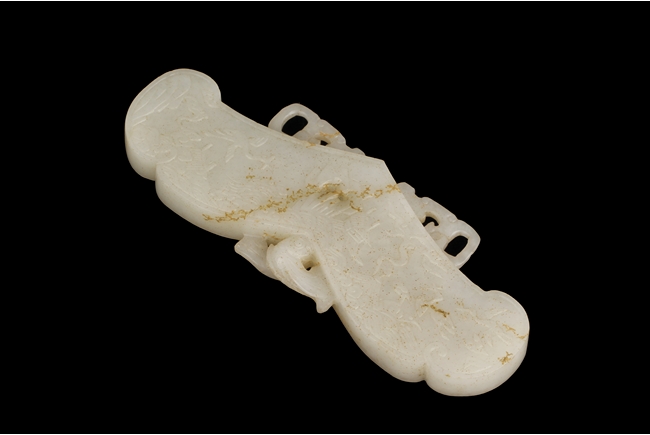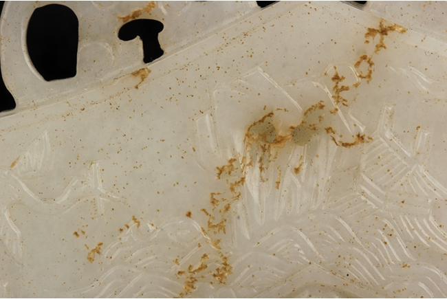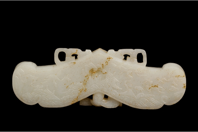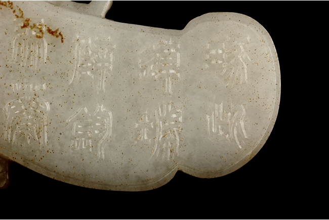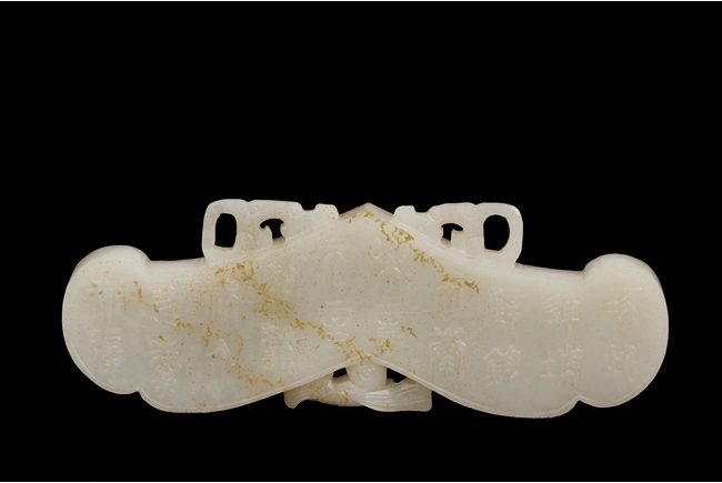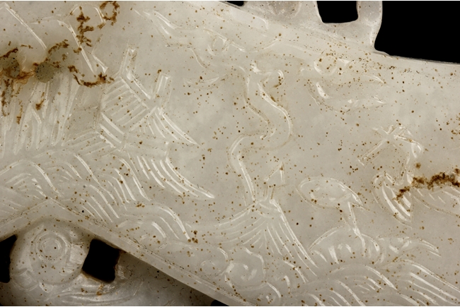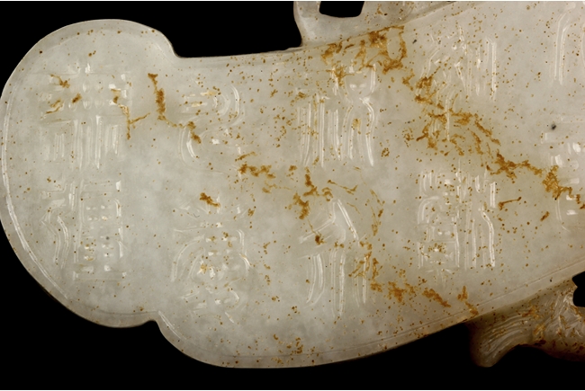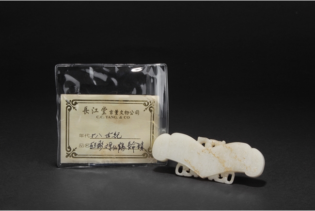 The carving depicts a longevity lock, the front side depicts flying cranes amid clouds over ocean waves, the reverse carved with Chinese characters. 18th century.