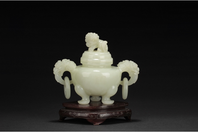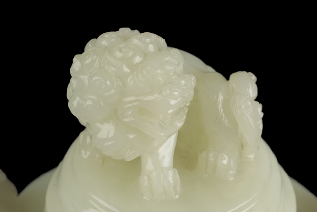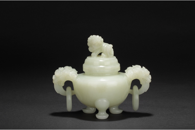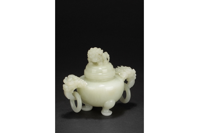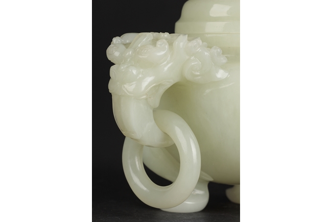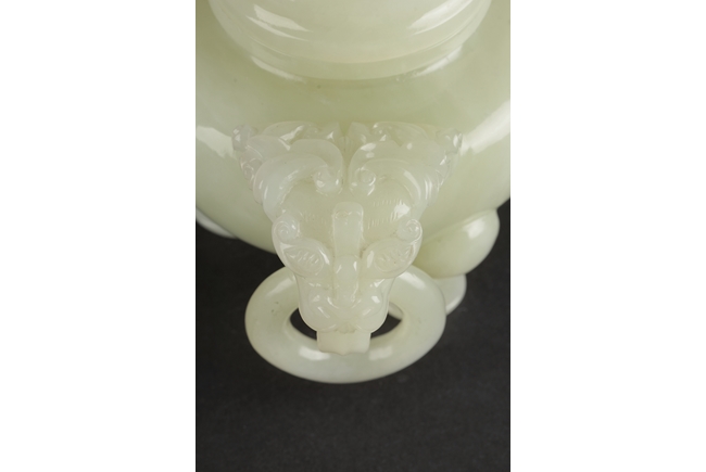 Of globular form, the censer supported by three short legs, the pair of lion mask ring handles each with a loop carved from the body, the lid surmounted by a lion; the stone of even and smooth celadon color. 19th century.