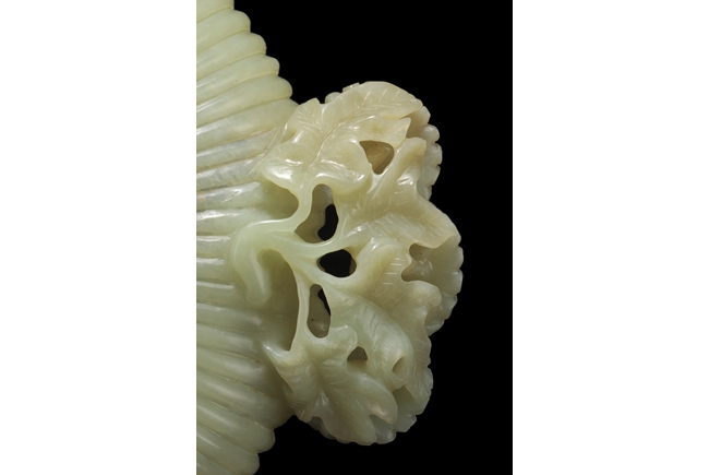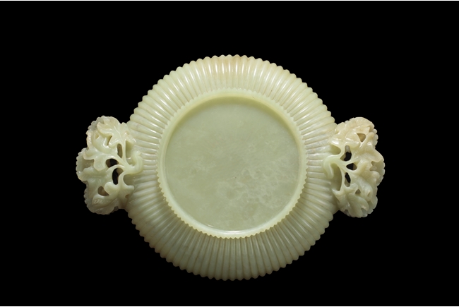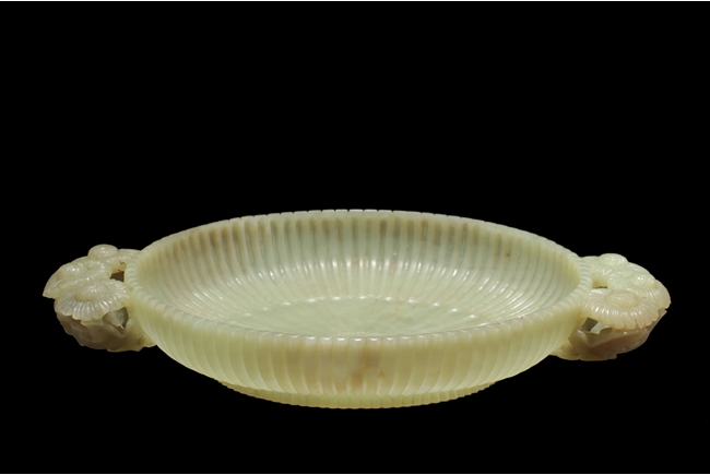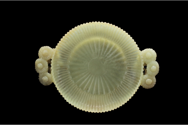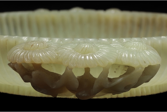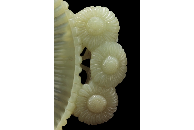 The washer of floriform, the entire body depicts a chrysanthemum flower, the two handles each composed of three blossoming chrysanthemum flowers with branches and leaves, the foot ring carved in same motif; the stone of celadon color. Qing Dynasty period.