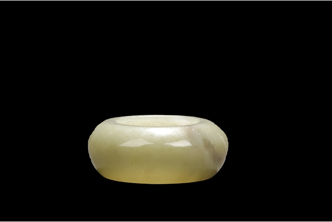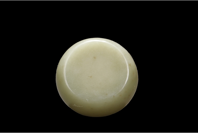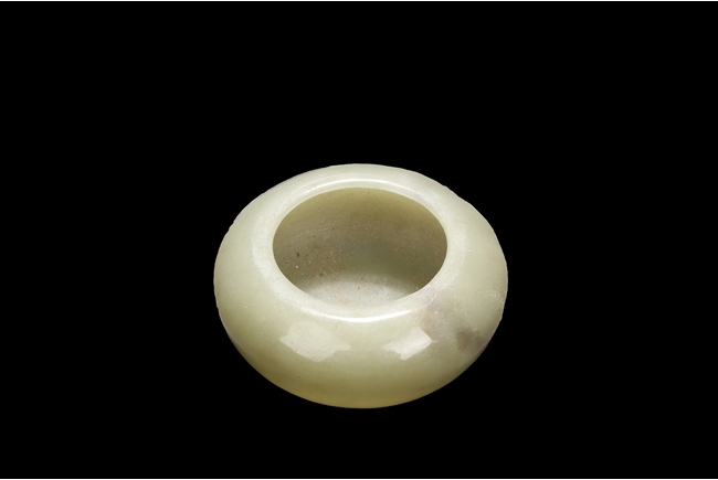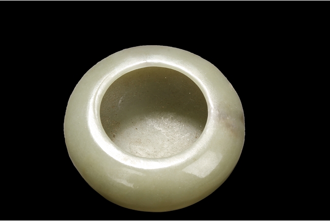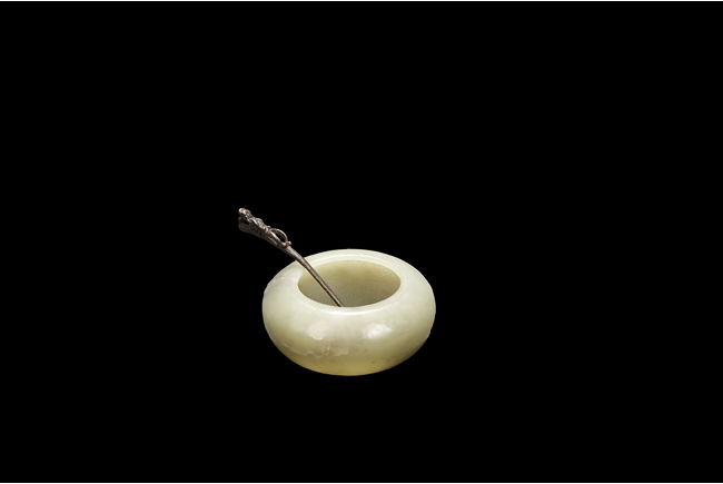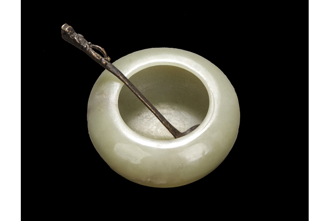 Of compressed globular form, the washer with a small round opening on top, the stone of celadon color with natural features, and the spoon with a dragon head and pearl handle. Qing Dynasty period.