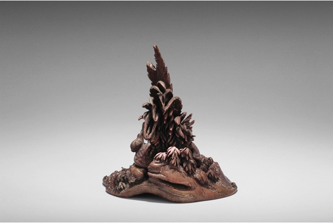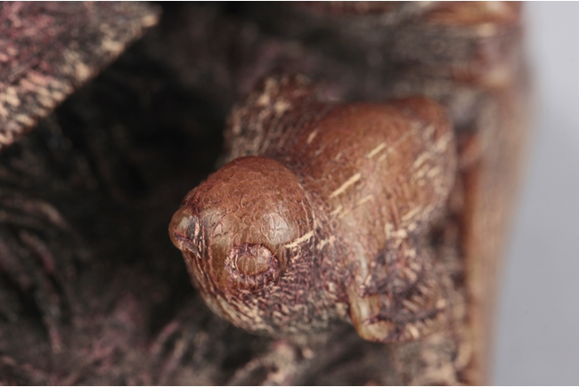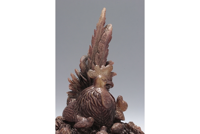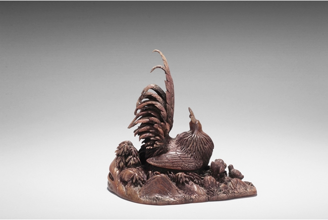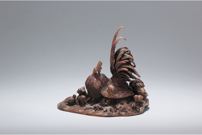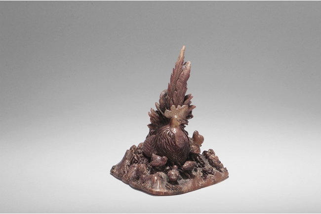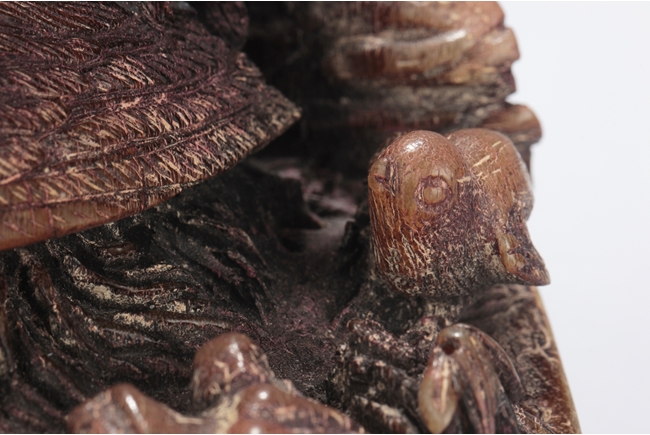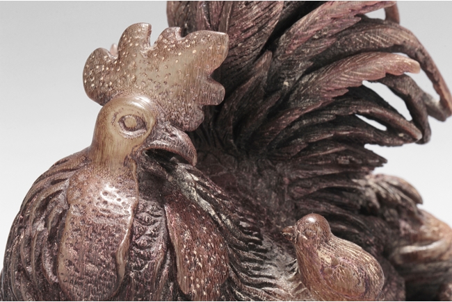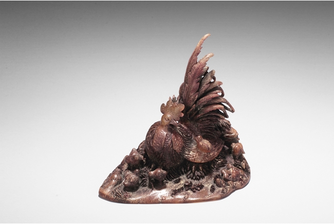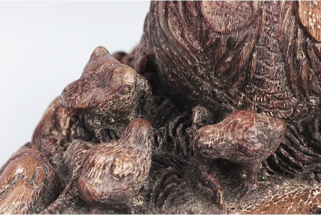 Carved from a rhinoceros horn, the figural group depicts a protective rooster with five chicks. The rooster stands on grass covered ground, wings slightly open, head turned to the left with beak open, tail raised high and proud. Three chicks gathered close by the front of rooster, seeking food on the ground, one chick playfully stands on the rooster's left wing, and the last chick looking up to the rooster from its left side. Carved in great detail, the figural group retains the natural brown-red color of rhinoceros horn. Bottom with R.O.C. Wildlife Product registration number 64000-00000135 sticker. Early Qing Dynasty period.