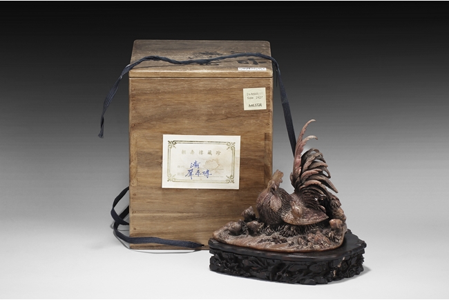 此犀牛角擺件雕工細膩、一流,栩栩如生,充分體現了公雞的愛心和小雞的活潑可愛,在全球拍賣行中,此類拍品罕見,極為珍貴。底座為後配。附中華民國野生動物產製品註記號64000-00000135。