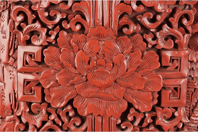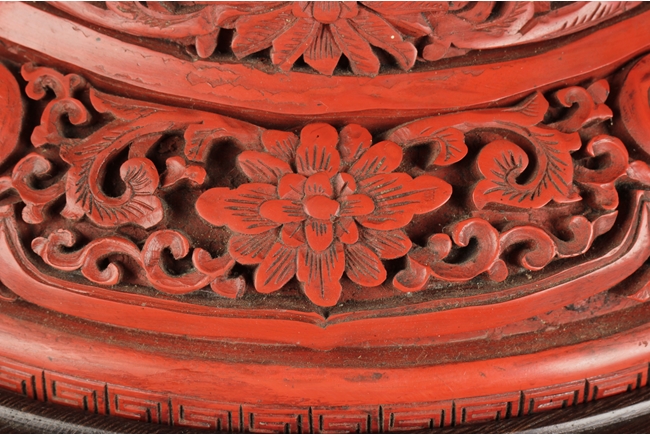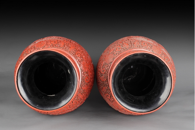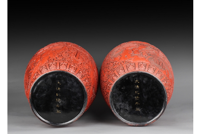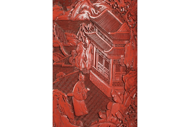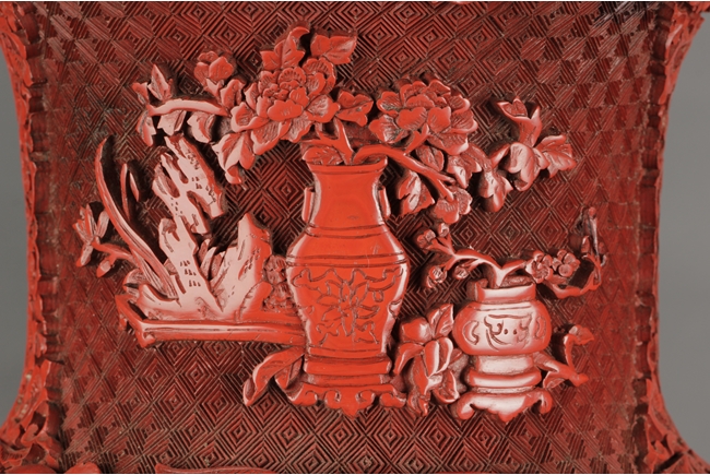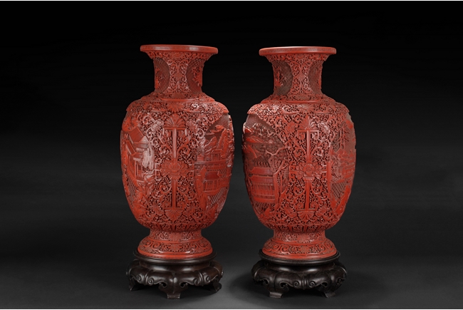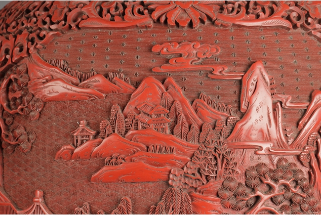 Of baluster form, the well carved body with two panels, each has a landscape scene including beautiful villages, busy villagers, flowing willow trees, dense pine trees, calm rivers, and small mountains, surrounded by intricate floral patterns and separated by peony flower at side, the neck carved with two panels of flower planters, and the bottom with six character "QIANLONG" mark. Qing Dynasty period.