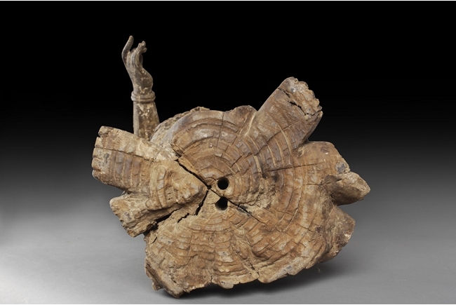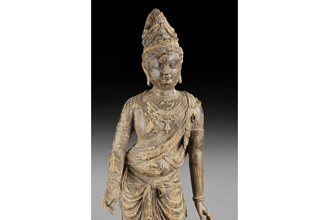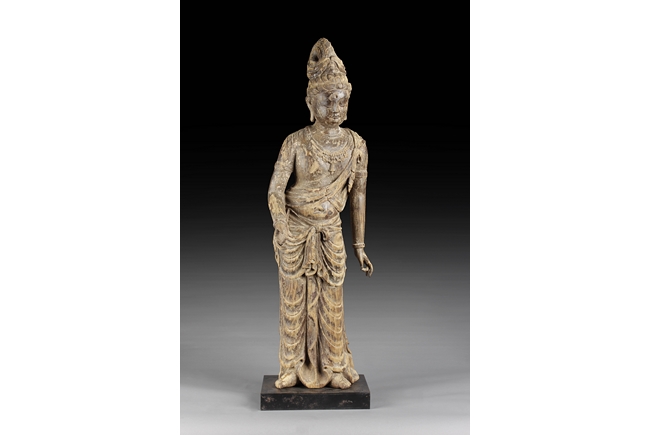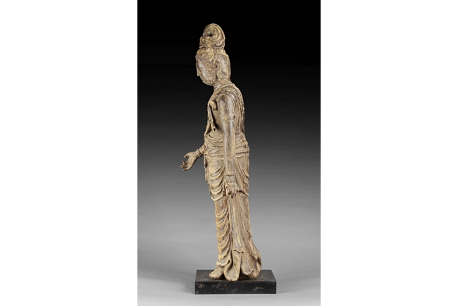 The figure depicts Guanyin standing slightly slanted with bare feet, left hand on the side, right hand slightly extended, wearing loose drapes hanging from left shoulder and a crown. Age related damage. Song Dynasty period.