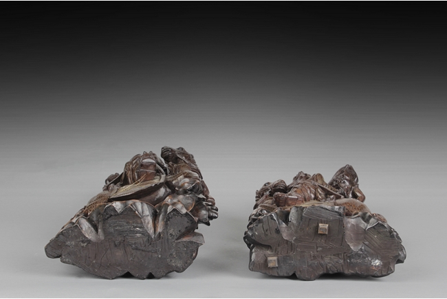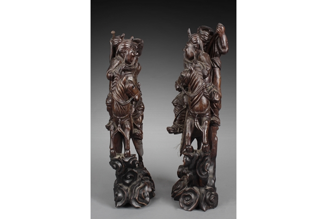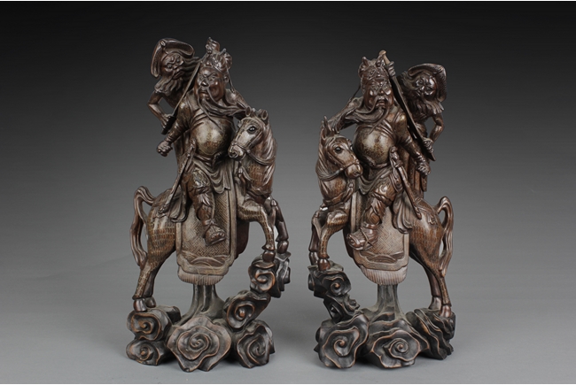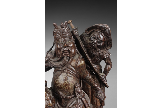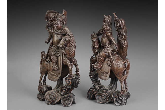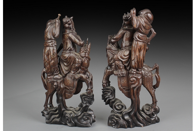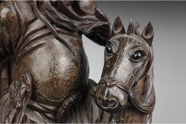 The figure depicts Guanyu, wearing armor with cloth on top, is mounted on a horse on top of clouds, while a bearded man with a machete is seen standing on the clouds behind Guanyu; silver lines inset into wood to create delicate patterns. Qing Dynasty period.