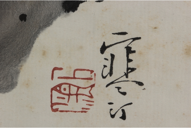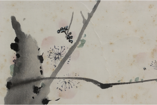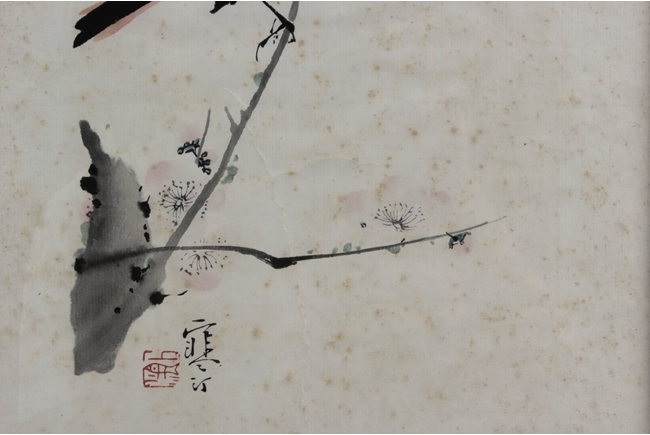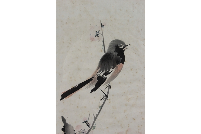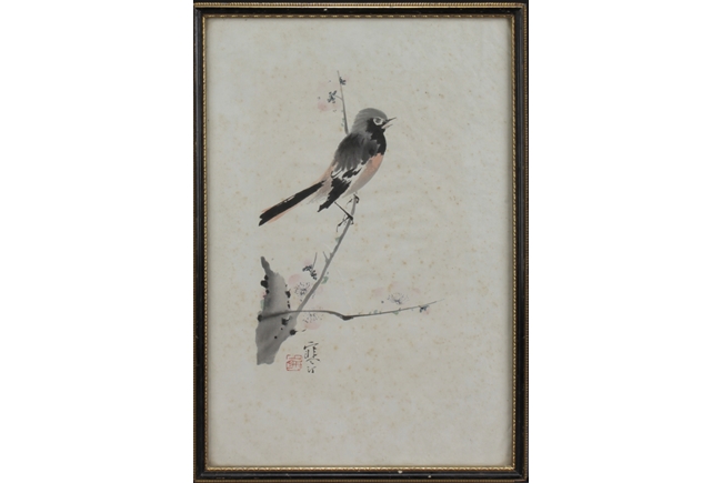 Ink and color on paper, framed, depicts a magpie bird perched on a branch of plum blossom tree, artist signature and mark 'Jiang Handing' on the bottom left.