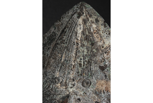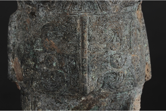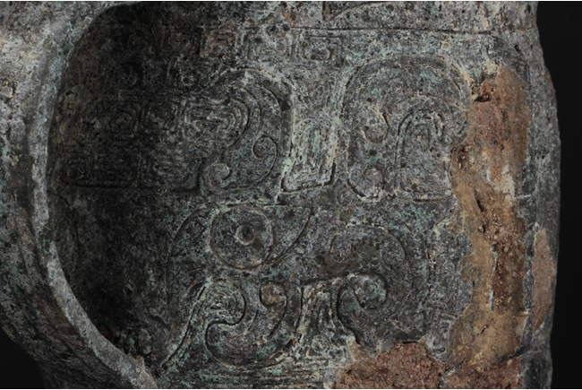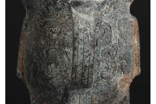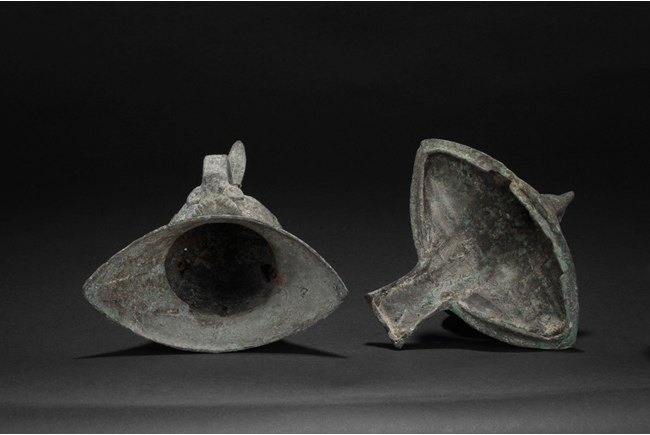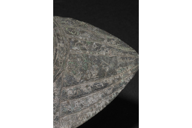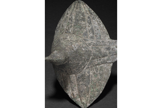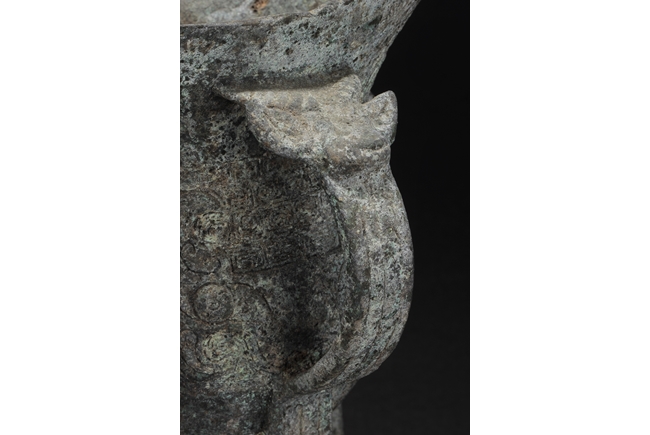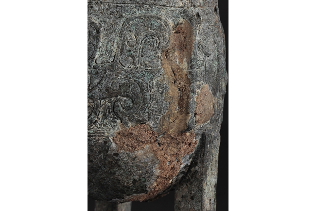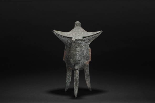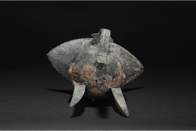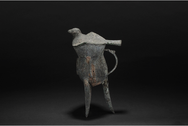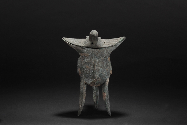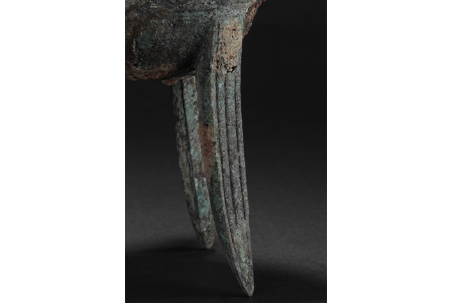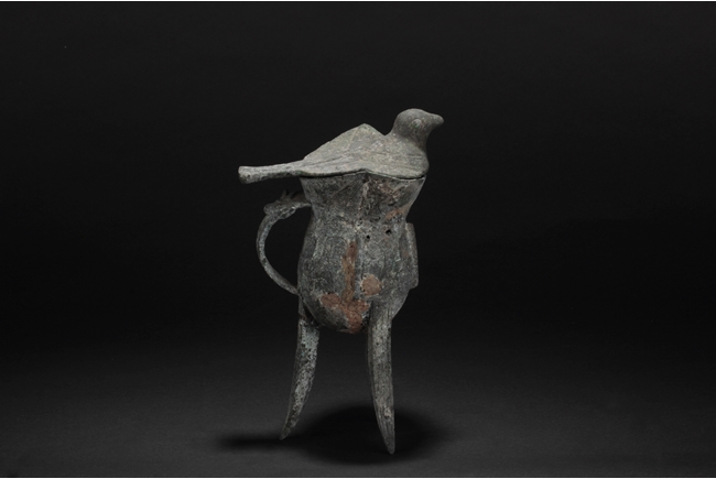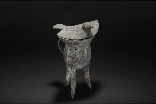 Raised on three tall curved blade-form legs, the bulbous body cast in soft relief with Taotie mask, the fitted cover of bird form. Age related wear and damage. Shang Dynasty period.