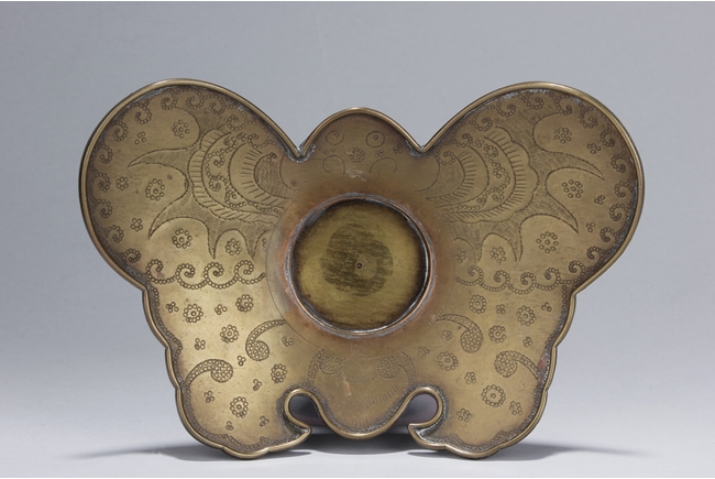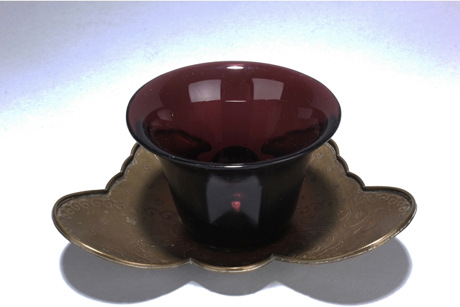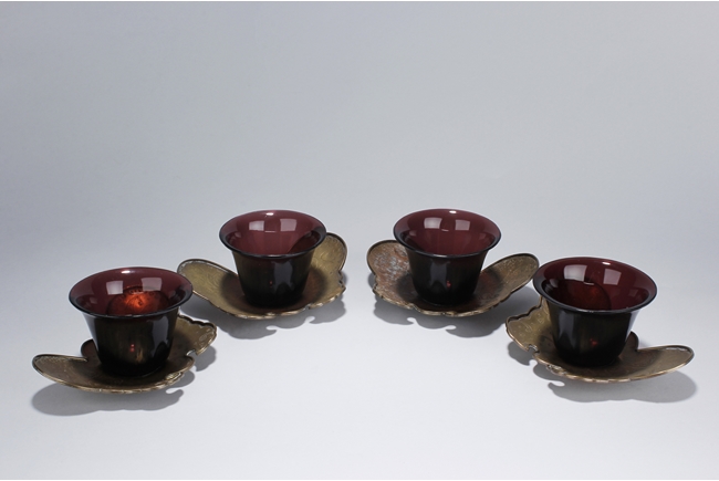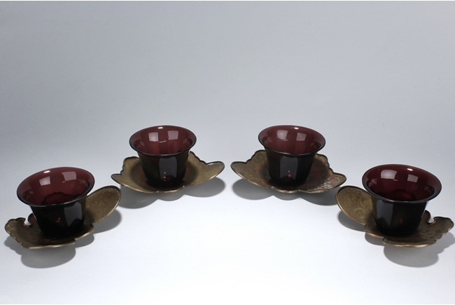 These four cups are identical in design and all possess a maroon-violet hue. It rests on a short foot that gradually curves out to form the body and mouth. The cups are perfectly smooth all around an sit on top of the silver butterfly shaped cup stands. The stand has small indents of patterned designs. Qing Dynasty period.