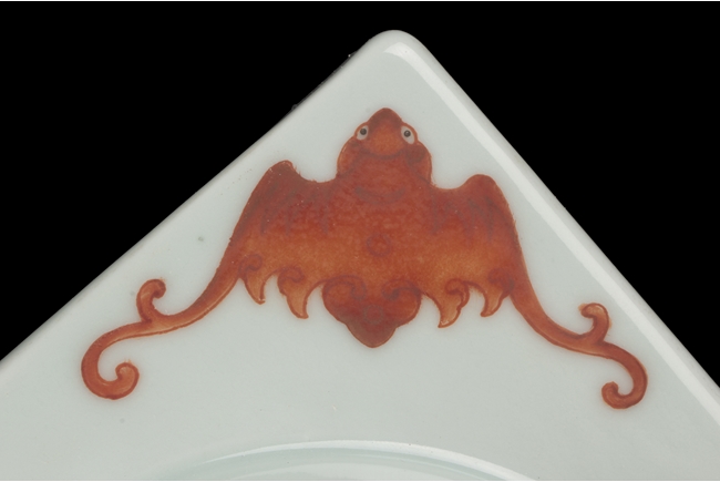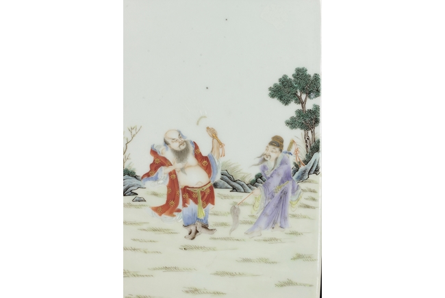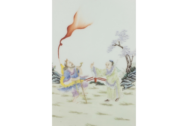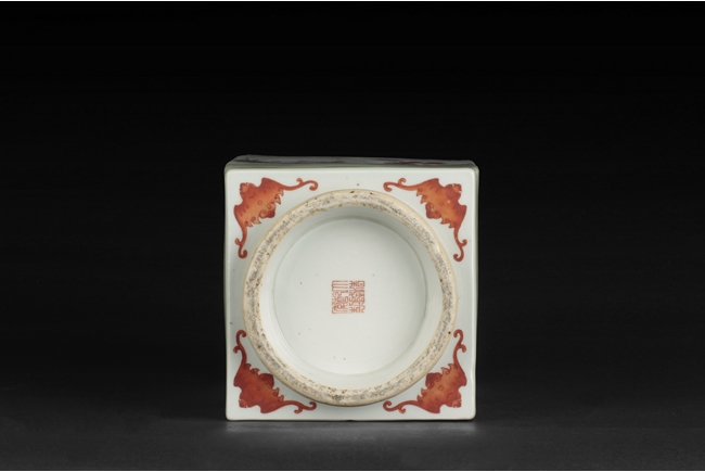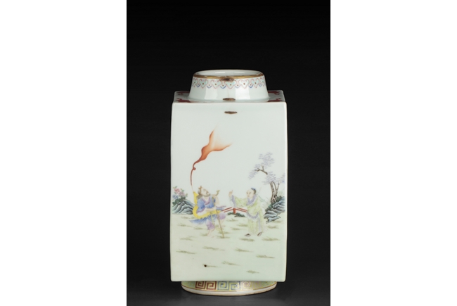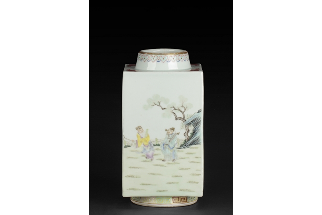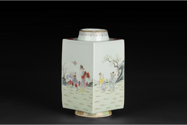 Of rectangular form, each side of the exterior painted with two Immortals in garden setting, the ring foot with key-fret patterns, shoulder with a bat in each corner, and neck with Ruyi head patterns; bottom bears six characters 'QIANLONG' mark. Repairs on the neck/rim. Qing Dynasty period.