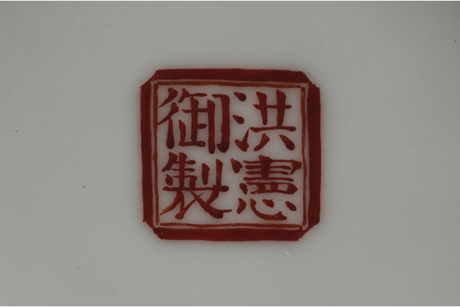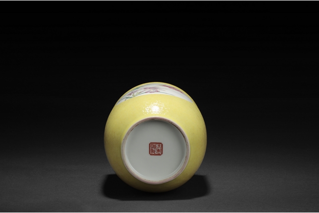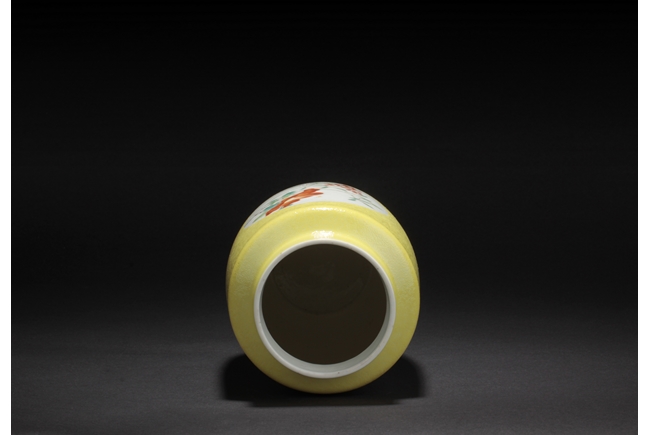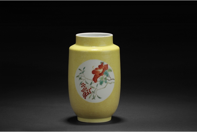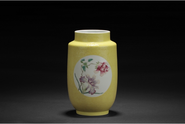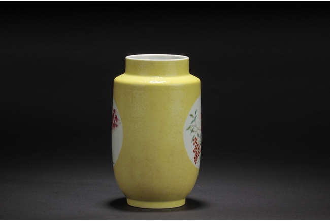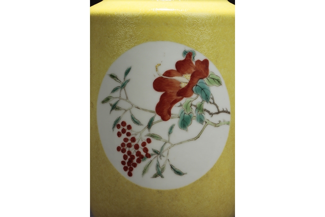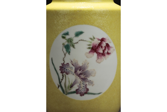 Of cylindrical form with straight neck and slightly tapering body, rests on a straight round feet, the body covered in yellow ground and surface with imprinted patterns, with two panels of differing flowers within, the bottom bears four character "HONGXIAN" mark. Qing Dynasty period.