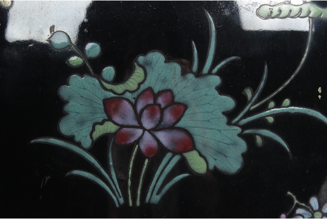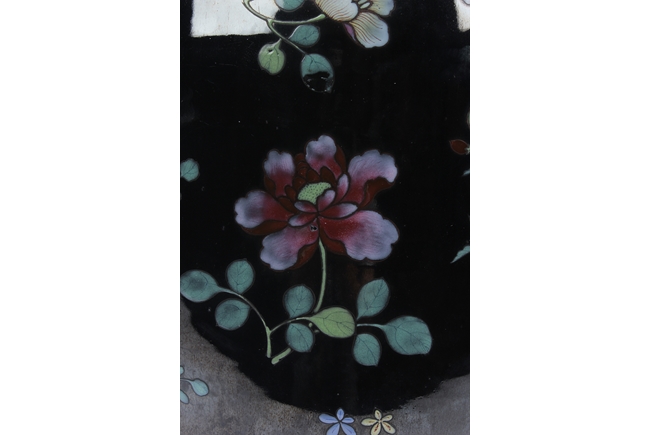 Of ovoid form, the exterior painted with a variety of flowers such as lotus, chrysanthemum, and peony, against rich black ground, in between scrolling band of ruyi head patterns encased with similar motif flowers, and includes an en-suite pierce carved wood cover. Provenance: Estate of Thomas Chang of United States