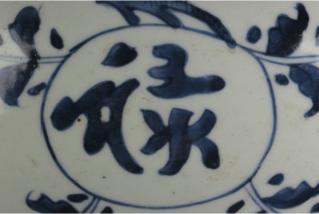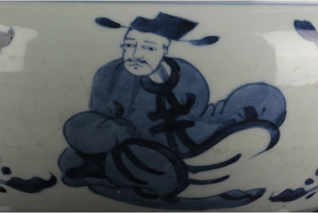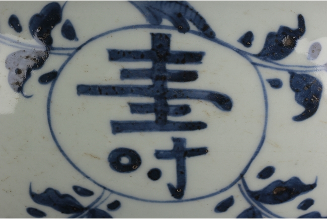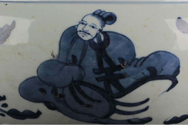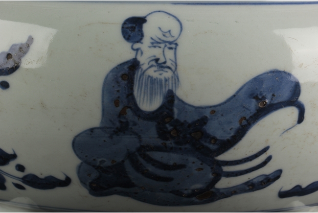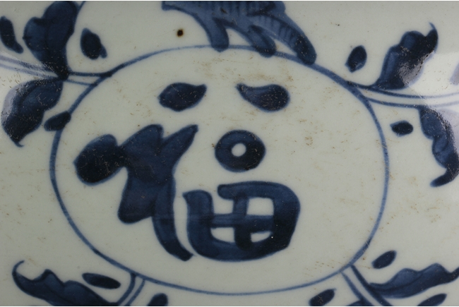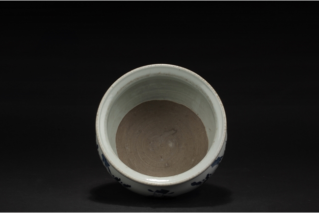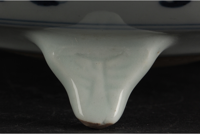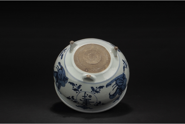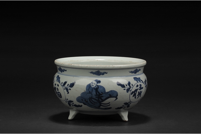Of globular form, the body supported by three triangular legs, the exterior painted with Fu, Lu, and Shou Star, each with the corresponding Chinese character enclosed in leafy flowers next to it, the bottom unglazed. Qing Dynasty period.