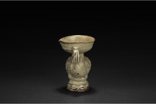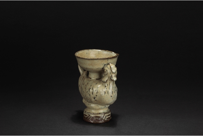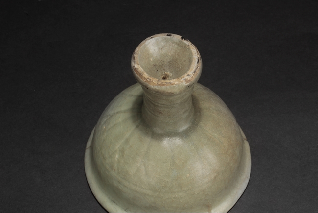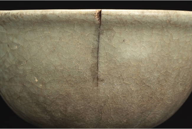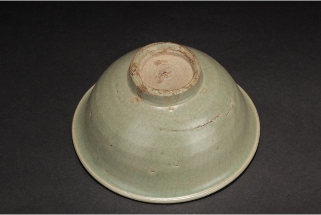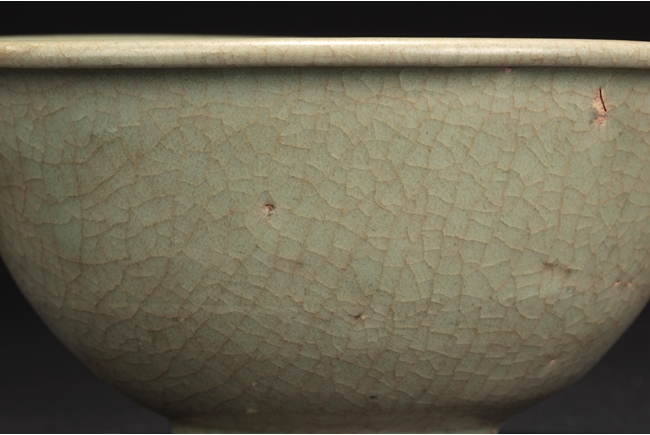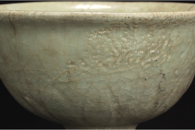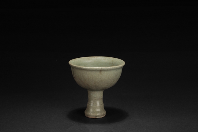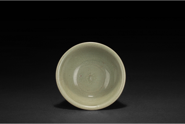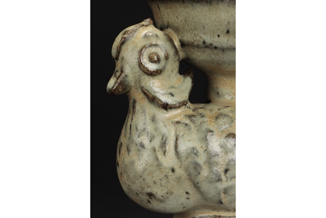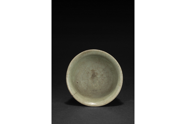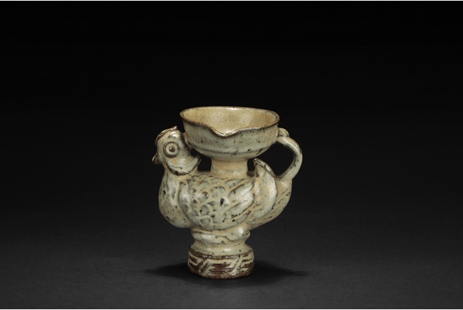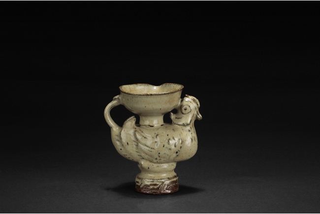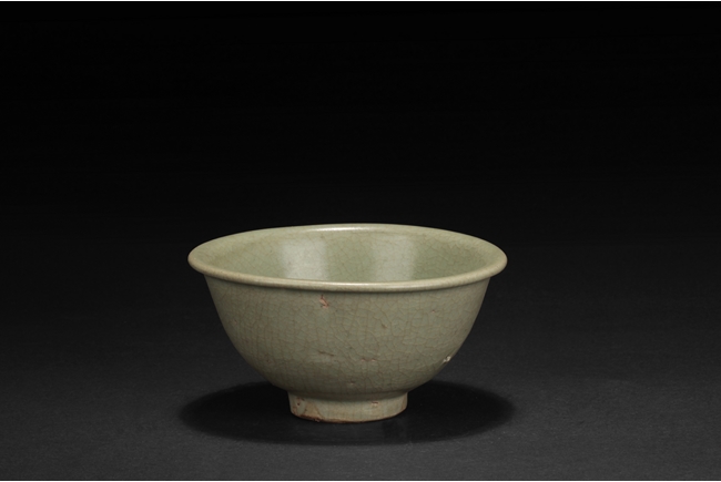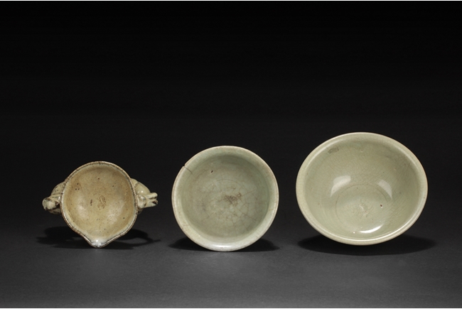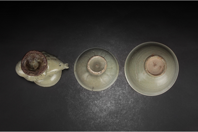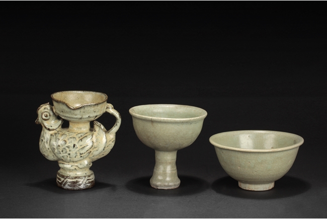 The group includes a bowl, a cup, and a bird form vessel, all with celadon glaze. The bowl with straight foot and flared rims, the body covered with crackle glaze, and the cup of similar design and with a tall foot. The bird-form vessel with pouring mouth on the very top, and handle connects from the back of bird to the top. Song Dynasty period.