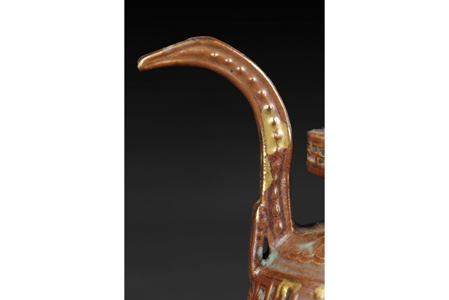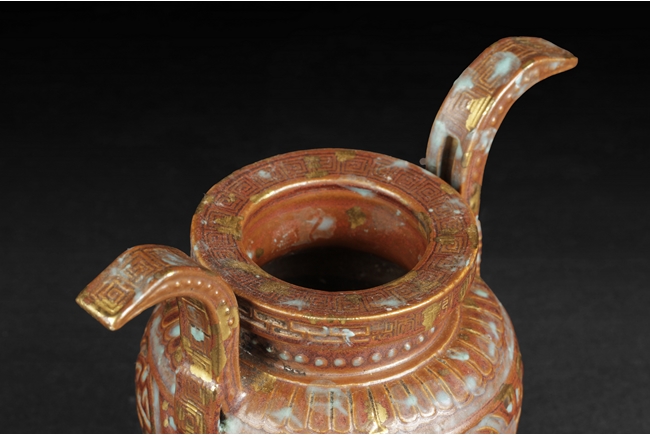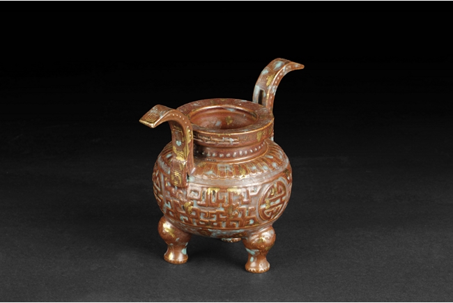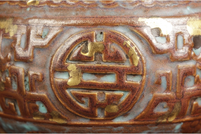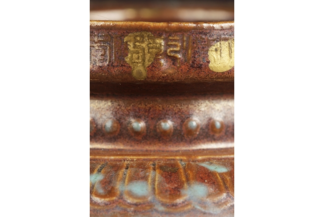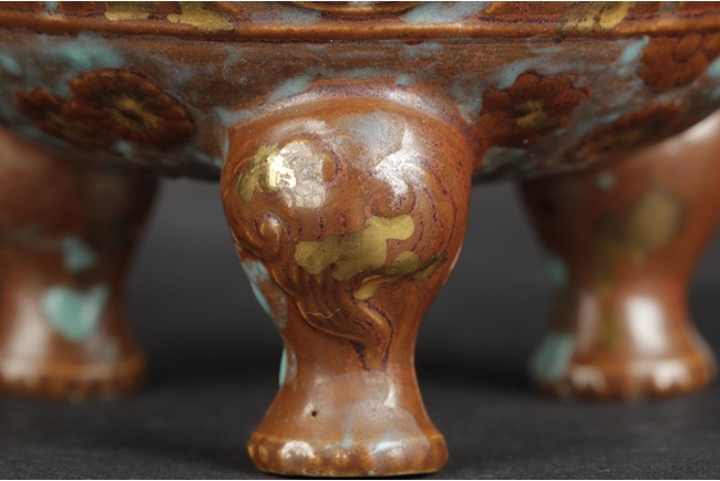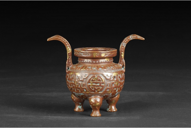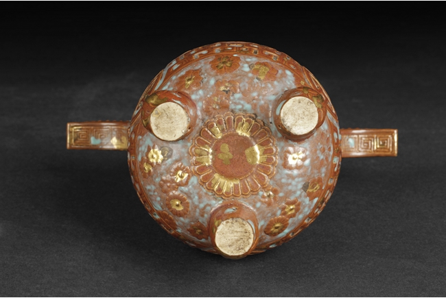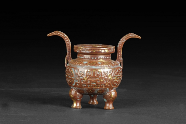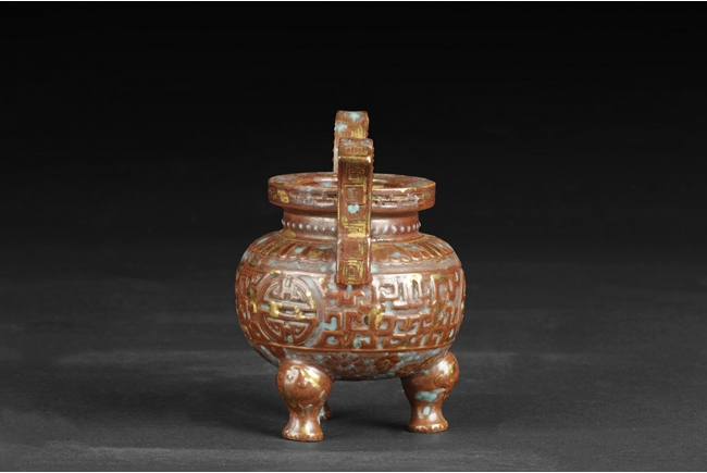 Of globular form with short neck and lipped rim, the censer supported by three beast legs, the body decorated with Chinese Shou character patterns in between scrolling flower pattern and lappet band pattern, splash gilt on the exterior, a pair of tall handles rise from the shoulder, the handles and rim decorated with key-fret patterns. Qing Dynasty period.