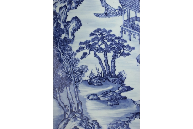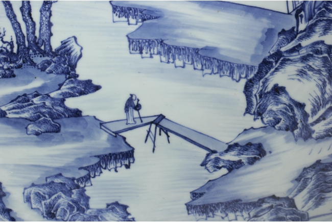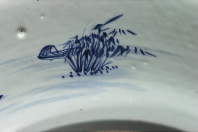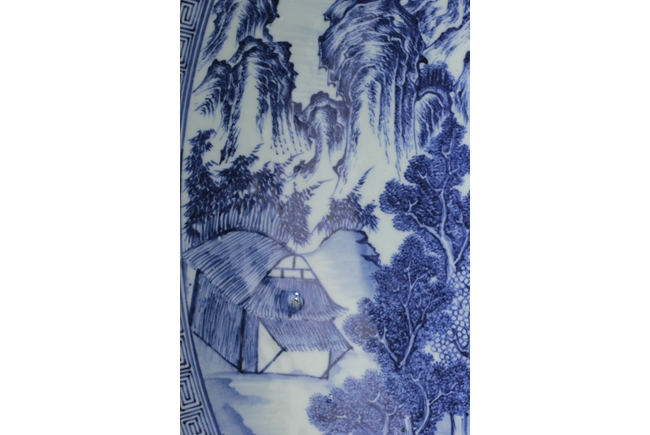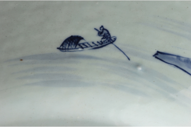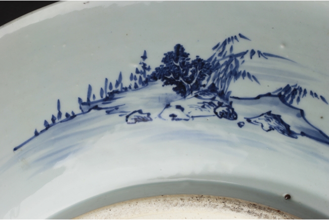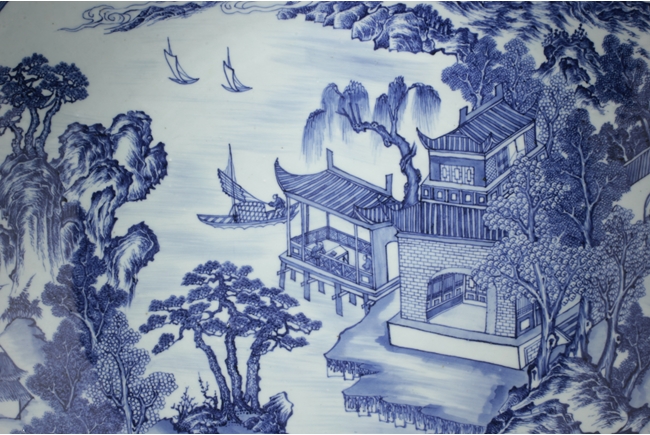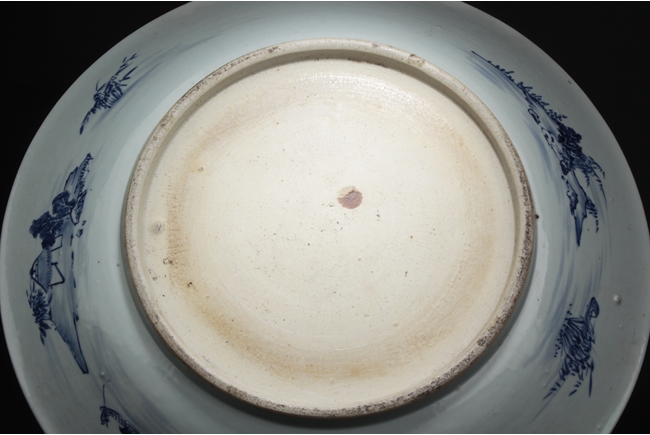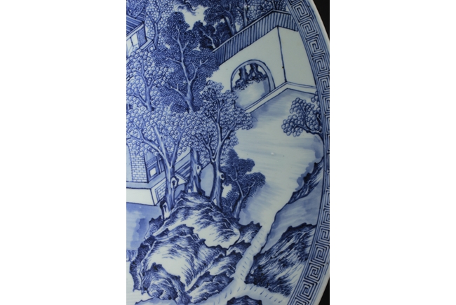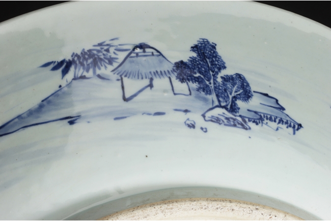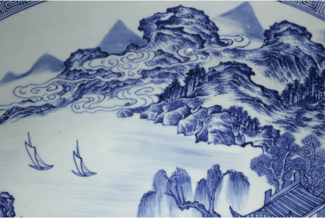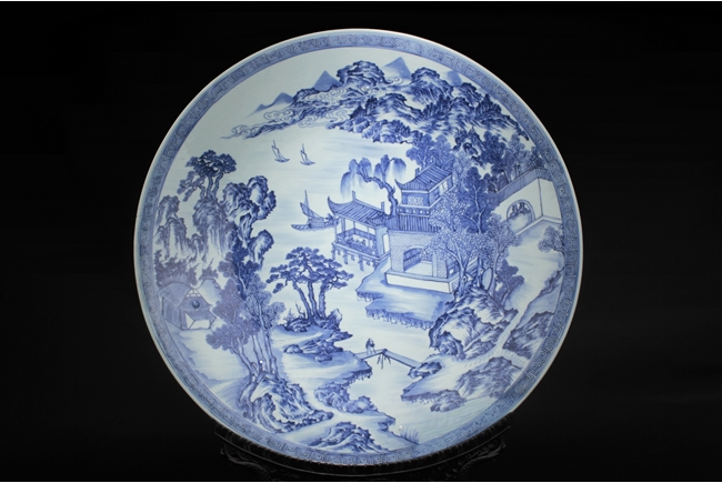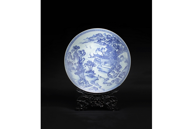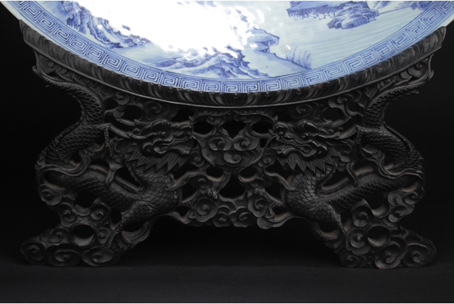The inside depicts a river side village scene, with tall mountains, flowing clouds, sailing ships, dense trees, well-built buildings, and villagers, all within a scrolling band of key-fret pattern, the underside with small huts and plants near river side with similar motif, rests on a pierce carved wooden stand, with two confronting four-clawed dragons chasing flaming pearl amidst clouds. Qing Dynasty period. Provenance: Estate of Thomas Chang of United States