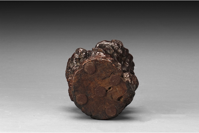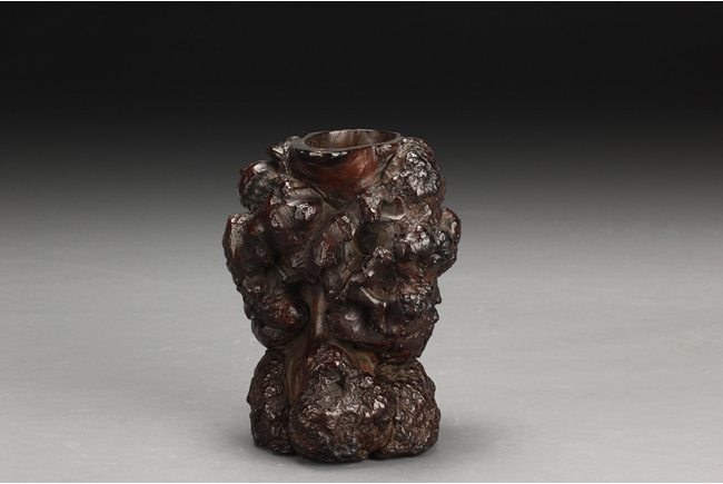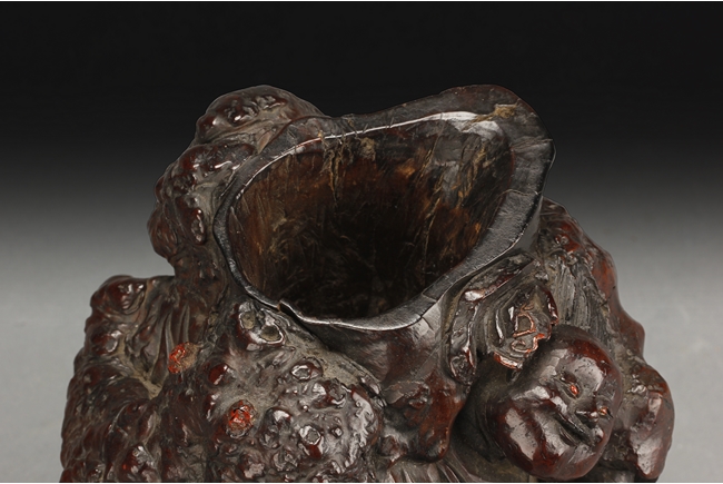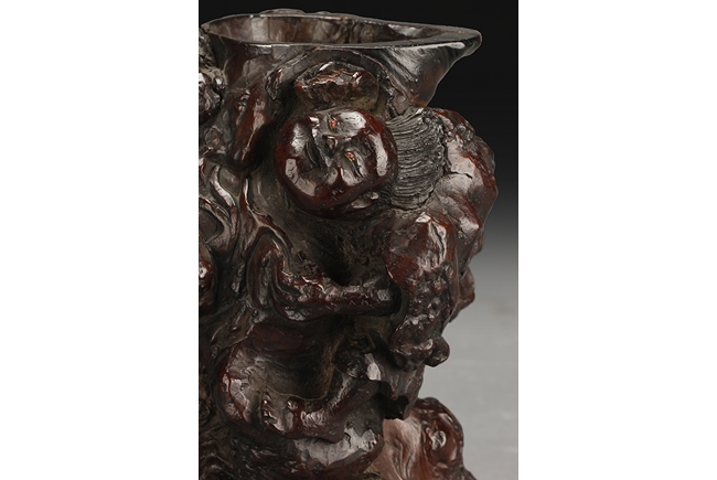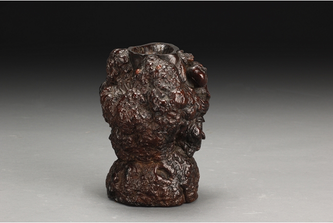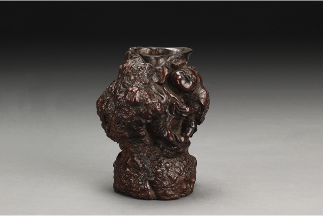 Irregularly carved and shaped, the brush pot features a deep, smooth tone, on the body carved with a Yaoguai climbing to the side, head looking upwards. A few age-related cracks. Qing Dynasty period.