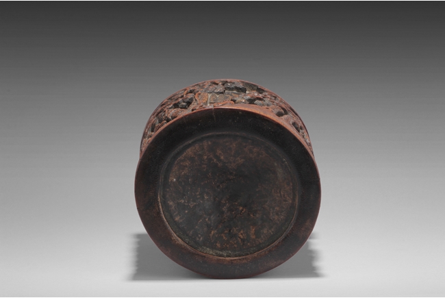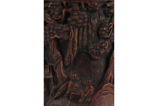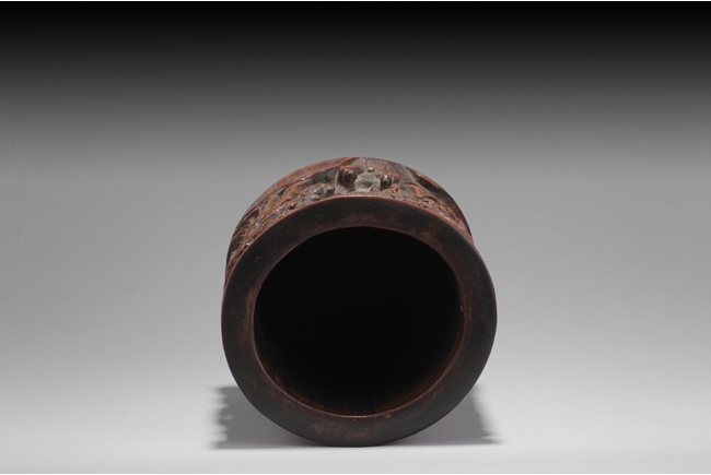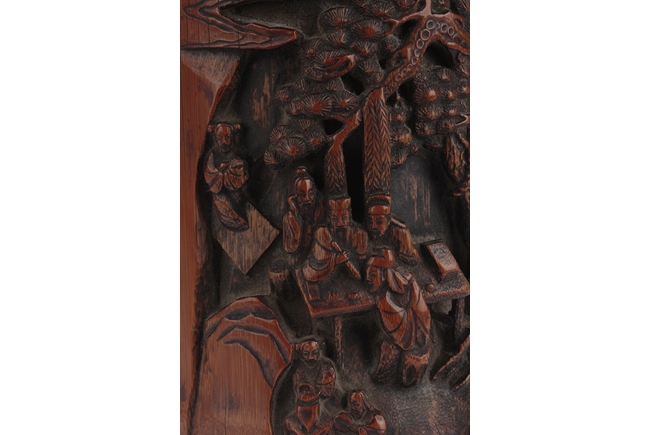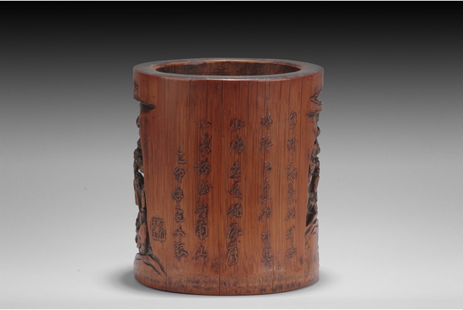 Of cylindrical form, the brush pot low relief carved with elders and kids enjoying different activities within a mountain and forest setting, the back carved with Chinese poem, complete with artist signature and mark. Qing Dynasty period.